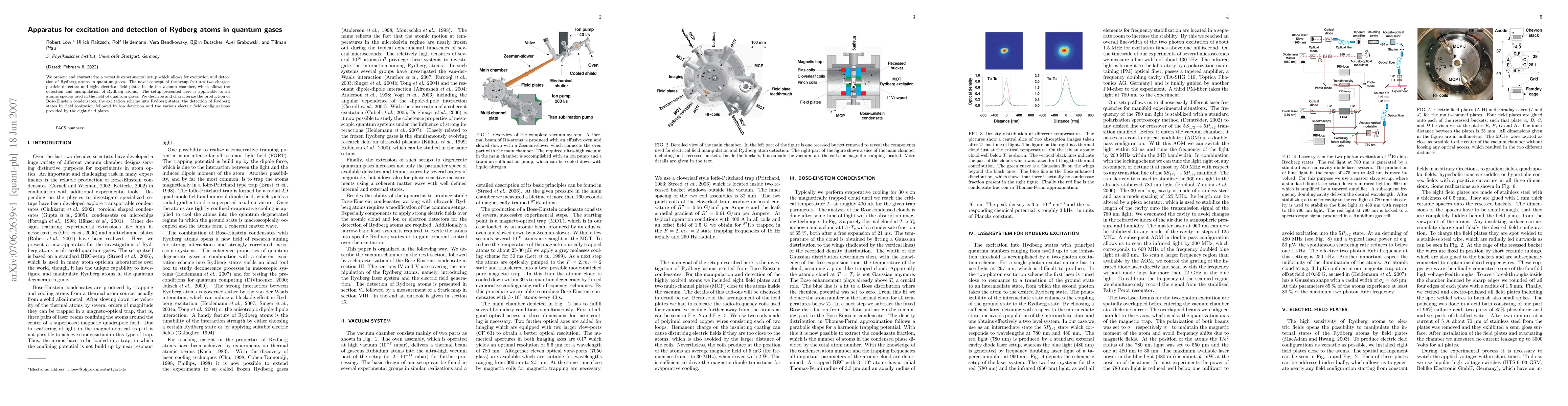 We present and characterize a versatile experimental setup which allows for excitation and detection of Rydberg atoms in quantum gases. The novel concept of the setup features two charged particle detectors and eight electrical field plates inside the vacuum chamber, which allows the detection and manipulation of Rydberg atoms. The setup presented here is applicable to all atomic species used in the field of quantum gases. We describe and characterize the production of Bose-Einstein condensates, the excitation scheme into Rydberg states, the detection of Rydberg states by field ionization followed by ion detection and the various electric field configurations provided by the eight field plates.
