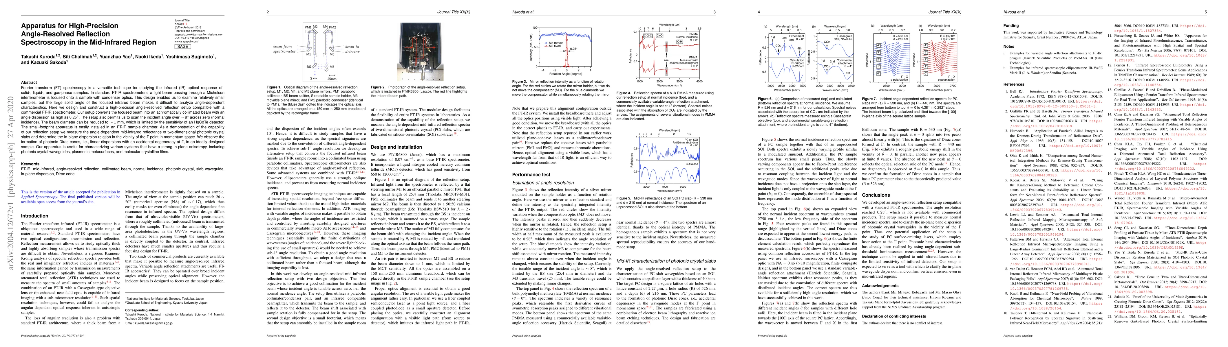 This paper describes a high-precision angle-resolved reflection spectroscopy setup for mid-infrared Fourier transform spectroscopy, enabling detailed analysis of angle-dependent optical responses. The apparatus converts focused beams to collimated ones, allowing for incident angle scans and small beam diameters, demonstrating its capability by measuring photonic Dirac cones in photonic crystal slabs.