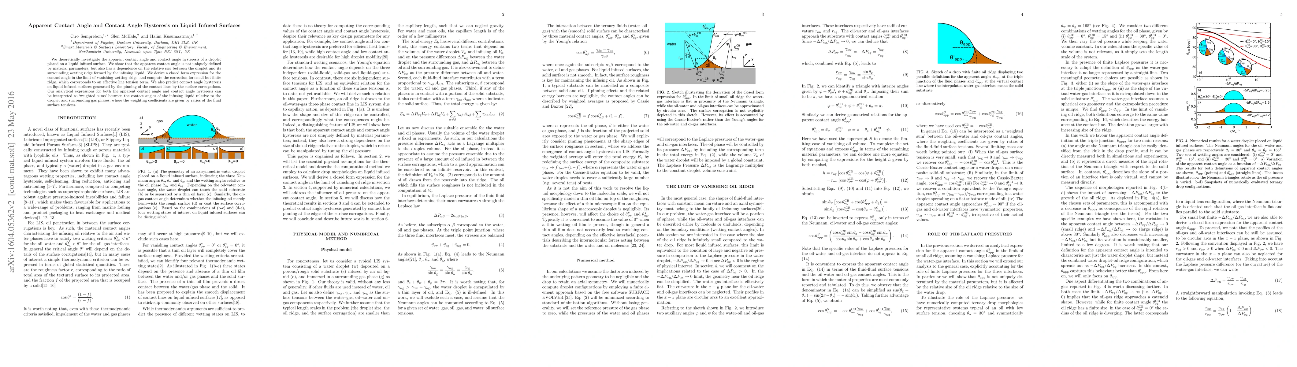 This paper investigates how droplet contact angle and hysteresis on liquid-infused surfaces depend on the size of the droplet relative to the surrounding wetting ridge. The authors derive a closed-form expression for contact angle and predict hysteresis due to contact line pinning by surface corrugations.