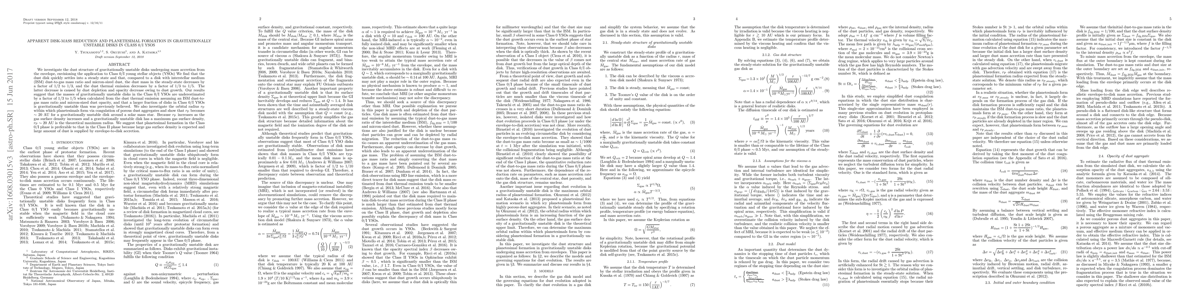 This paper examines the dust structure in gravitationally unstable disks around Class 0/I young stellar objects, finding significant dust mass reduction and thermal emission decrease due to dust growth. It suggests a reevaluation of disk mass estimates and proposes that planetesimals form at a maximum radius of ~20 AU in these disks.