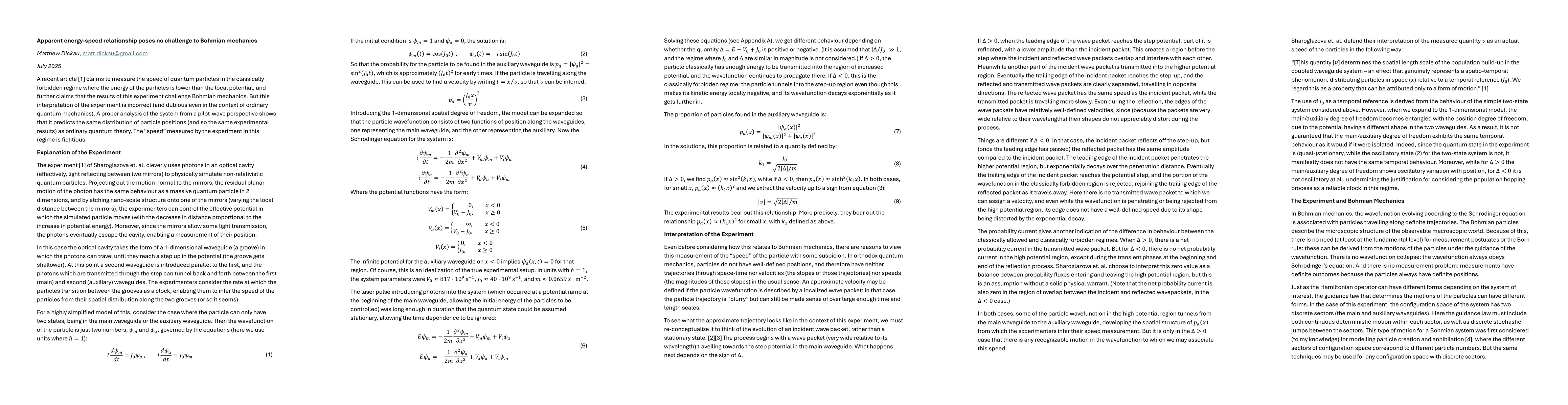 A recent article claims to measure the speed of quantum particles in the classically forbidden regime where the energy of the particles is lower than the local potential, and further claims that the results of this experiment challenge Bohmian mechanics. But this interpretation of the experiment is incorrect (and dubious even in the context of ordinary quantum mechanics). A proper analysis of the system from a pilot-wave perspective shows that it predicts the same distribution of particle positions (and so the same experimental results) as ordinary quantum theory. The speed measured by the experiment in this regime is fictitious.