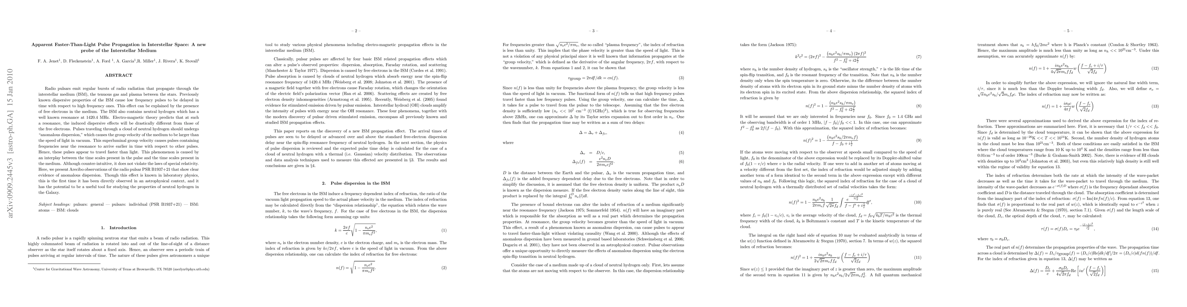 Radio pulsars show evidence of faster-than-light pulse propagation through interstellar space due to anomalous dispersion caused by neutral hydrogen clouds.