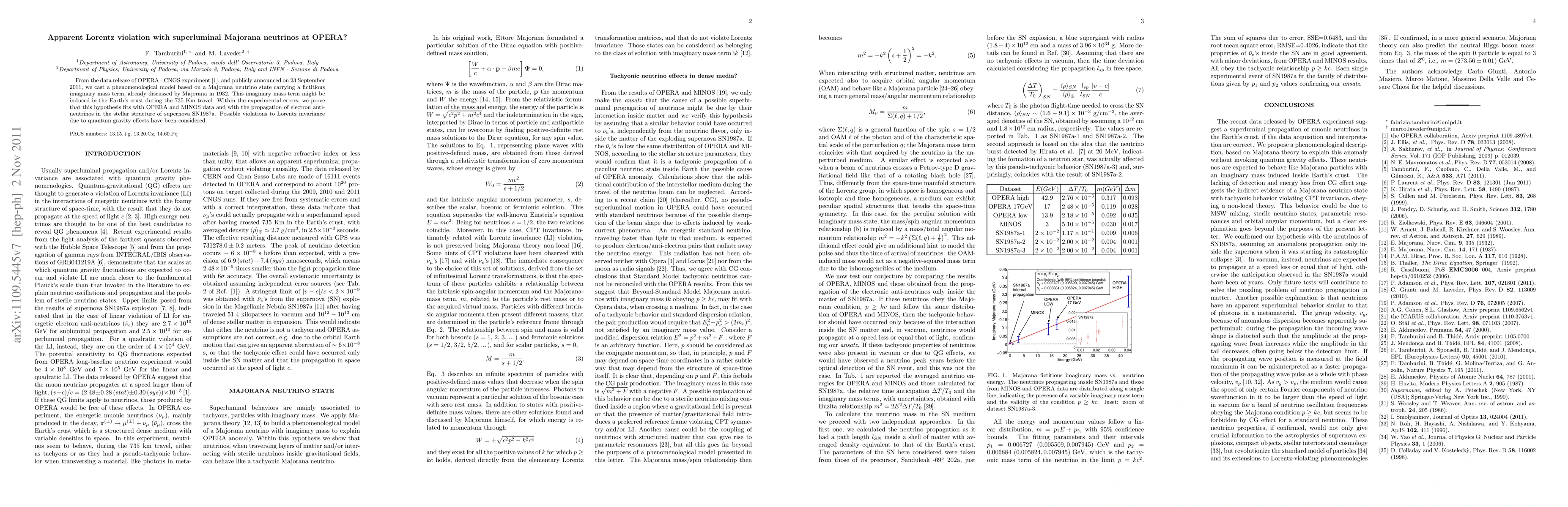 The OPERA experiment suggests apparent Lorentz violation through superluminal Majorana neutrinos with an imaginary mass term, fitting with OPERA, MINOS, and SN1987a data. This model considers potential quantum gravity effects on Lorentz invariance.