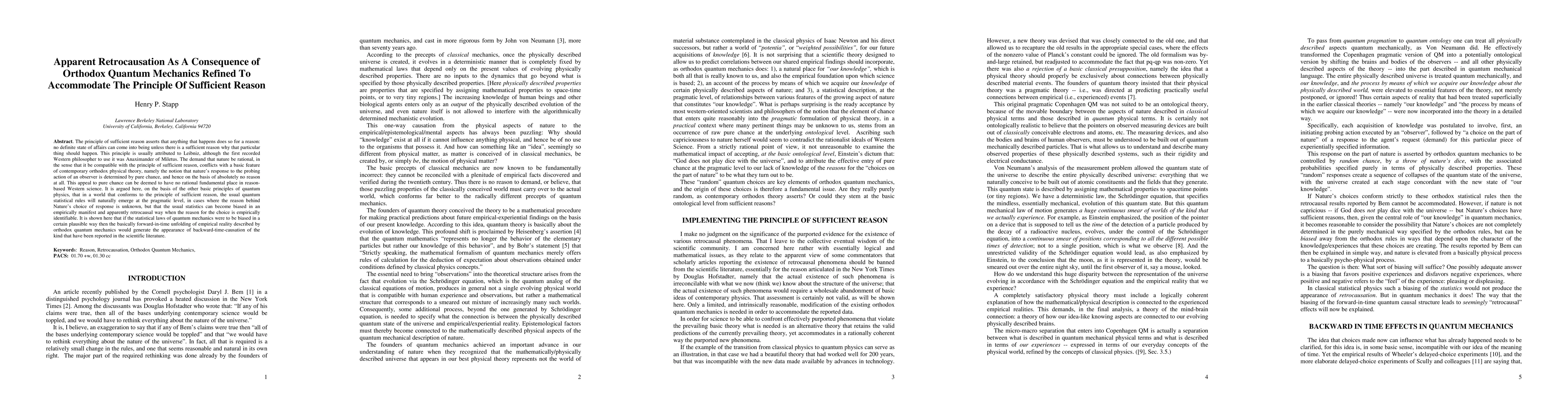 The principle of sufficient reason asserts that anything that happens does so for a reason: no definite state of affairs can come into being unless there is a sufficient reason why that particular thing should happen. This principle is usually attributed to Leibniz, although the first recorded Western philosopher to use it was Anaximander of Miletus. The demand that nature be rational, in the sense that it be compatible with the principle of sufficient reason, conflicts with a basic feature of contemporary orthodox physical theory, namely the notion that nature's response to the probing action of an observer is determined by pure chance, and hence on the basis of absolutely no reason at all. This appeal to pure chance can be deemed to have no rational fundamental place in reason-based Western science. It is argued here, on the basis of the other basic principles of quantum physics, that in a world that conforms to the principle of sufficient reason, the usual quantum statistical rules will naturally emerge at the pragmatic level, in cases where the reason behind Nature's choice of response is unknown, but that the usual statistics can become biased in an empirically manifest and apparently retrocausal way when the reason for the choice is empirically identifiable. It is shown here that if the statistical laws of quantum mechanics were to be biased in a certain plausible way then the basically forward-in-time unfolding of empirical reality described by orthodox quantum mechanics would generate the appearance of backward-time-causation of the kind that have been reported in the scientific literature.