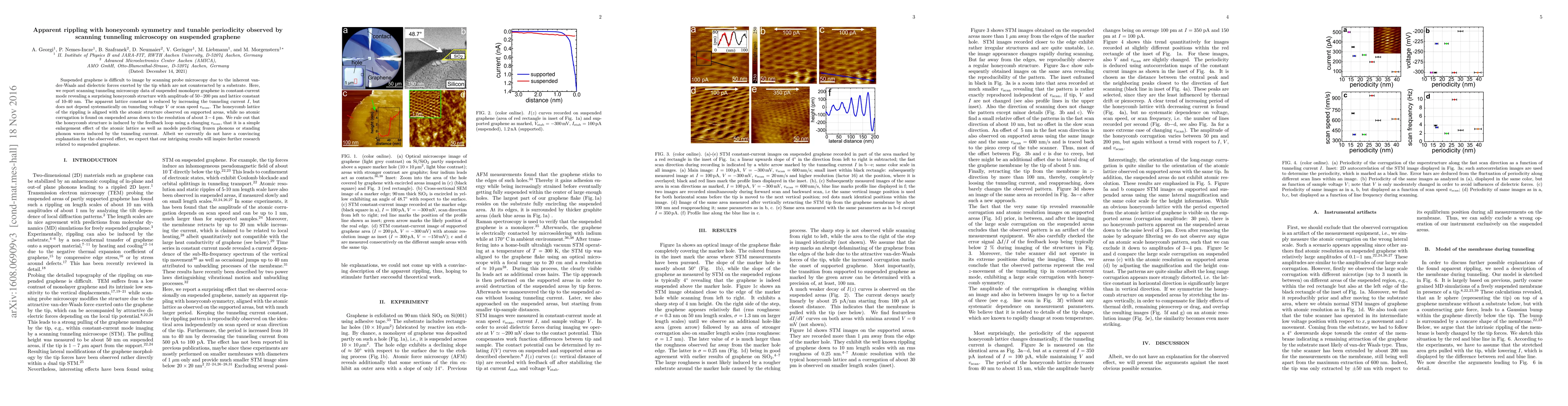 This study reveals honeycomb rippling patterns in suspended graphene observed by scanning tunneling microscopy, with tunable periodicity dependent on tunneling current. The observed lattice structure is distinct from atomic corrugation and does not correlate with tunneling voltage or scan speed, suggesting an unexplained phenomenon in suspended graphene.
