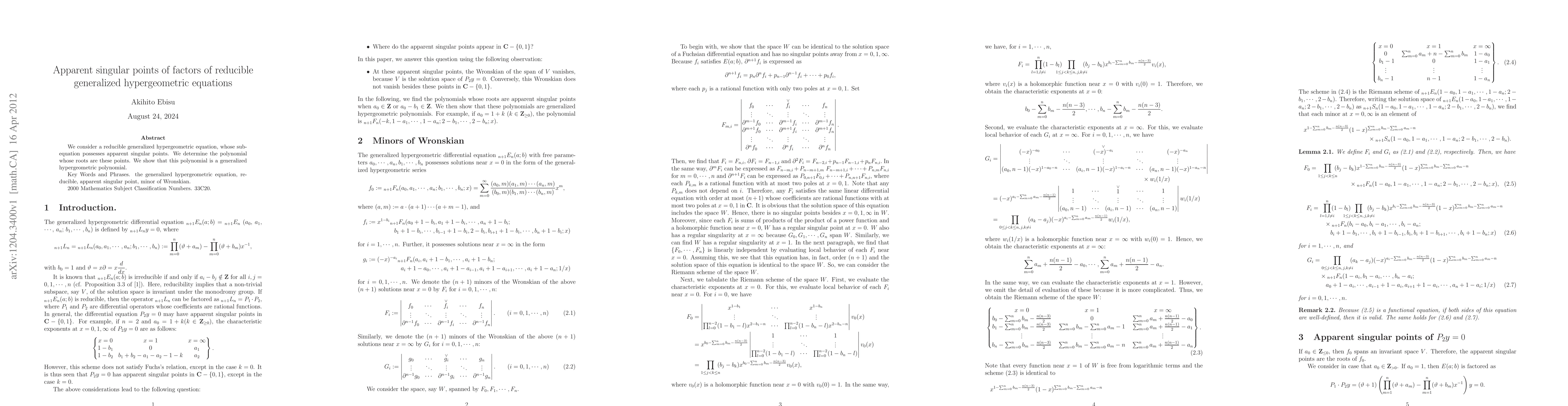 Summary: This paper investigates reducible generalized hypergeometric equations with apparent singular points in their sub-equations, identifying a polynomial whose roots correspond to these points, and demonstrates that this polynomial is itself a generalized hypergeometric polynomial.