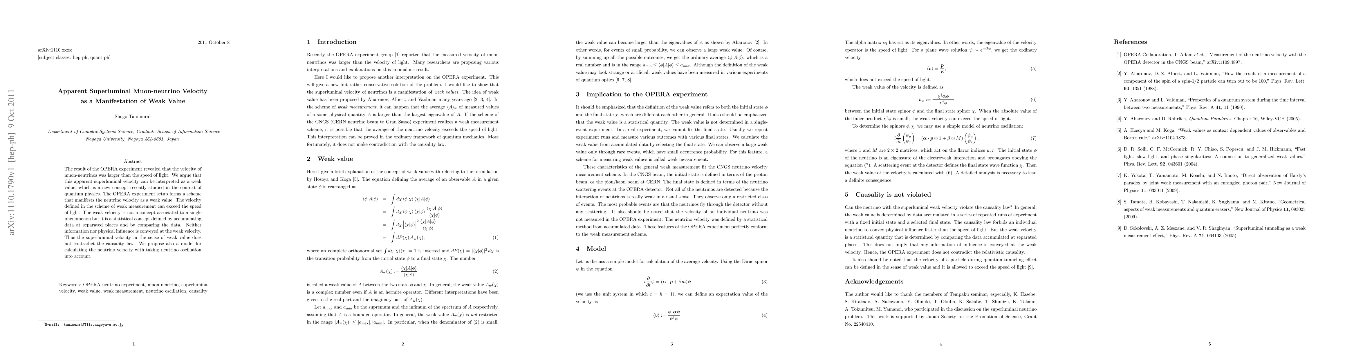 The OPERA experiment's observation of muon-neutrino velocities exceeding light speed is reinterpreted as a manifestation of weak value, a concept from quantum physics, which does not violate causality or convey information. A proposed model accounts for neutrino oscillation in calculating this velocity.