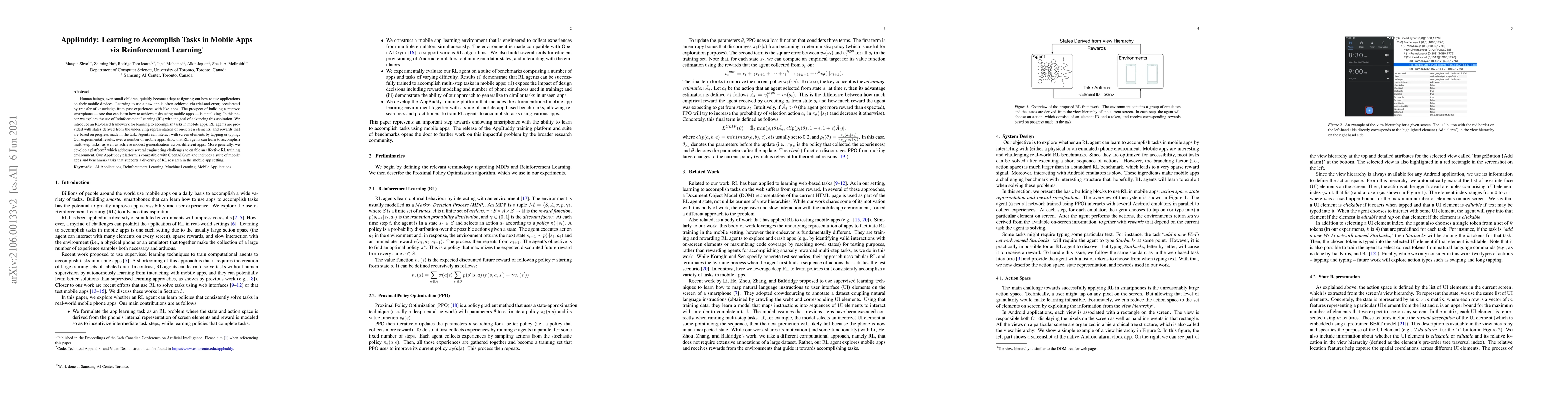 The paper introduces AppBuddy, an RL-based framework for teaching smartphone agents to learn and accomplish tasks in mobile apps using reinforcement learning. The platform demonstrates the ability of RL agents to perform multi-step tasks and shows modest generalization across different apps, while also addressing engineering challenges for effective RL training.