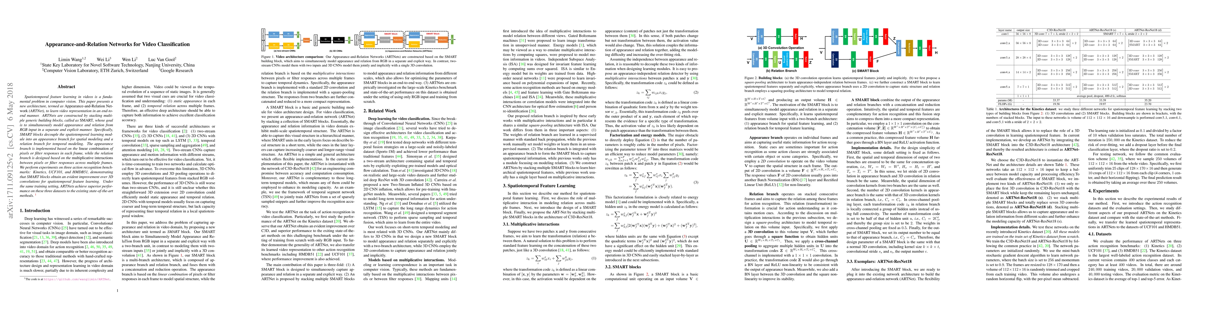A new video classification architecture, Appearance-and-Relation Network (ARTNet), achieves superior performance on action recognition benchmarks compared to existing state-of-the-art methods, outperforming 3D convolutions for spatiotemporal feature learning.