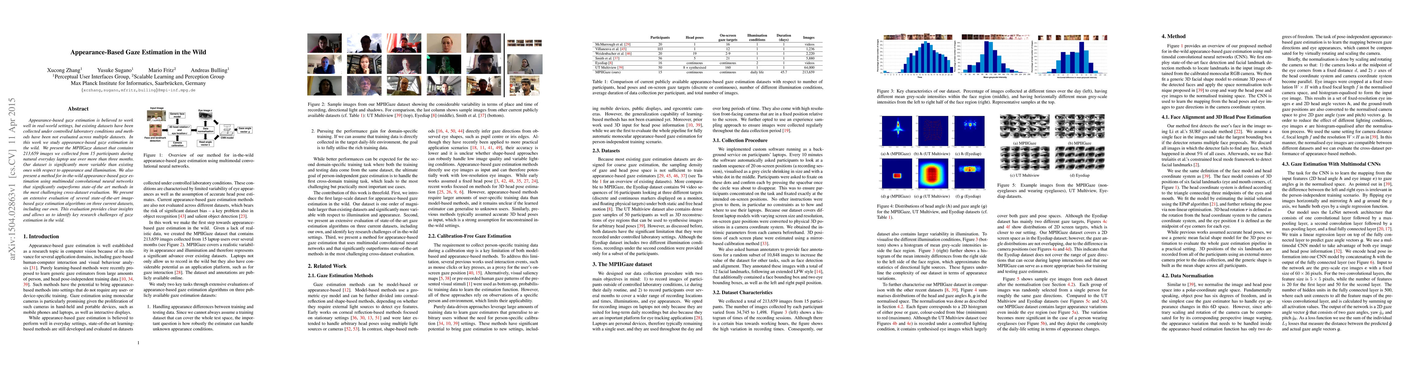 This paper introduces the MPIIGaze dataset, a large and variable collection of images from natural laptop use, and proposes a multimodal CNN method for appearance-based gaze estimation that outperforms existing methods in cross-dataset evaluations, highlighting key challenges in real-world gaze estimation.