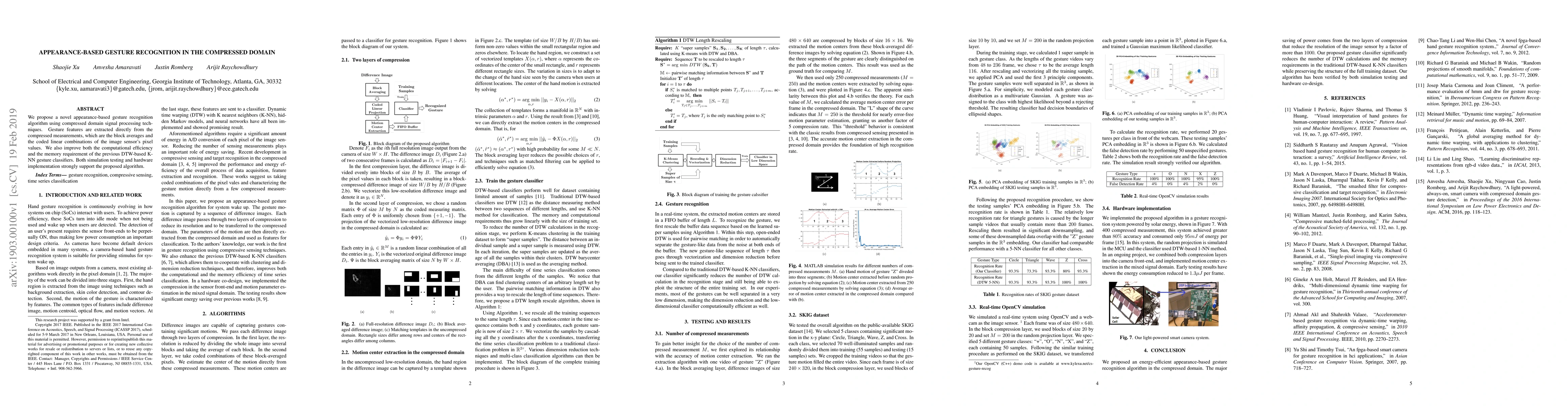 We propose a novel appearance-based gesture recognition algorithm using compressed domain signal processing techniques. Gesture features are extracted directly from the compressed measurements, which are the block averages and the coded linear combinations of the image sensor's pixel values. We also improve both the computational efficiency and the memory requirement of the previous DTW-based K-NN gesture classifiers. Both simulation testing and hardware implementation strongly support the proposed algorithm.