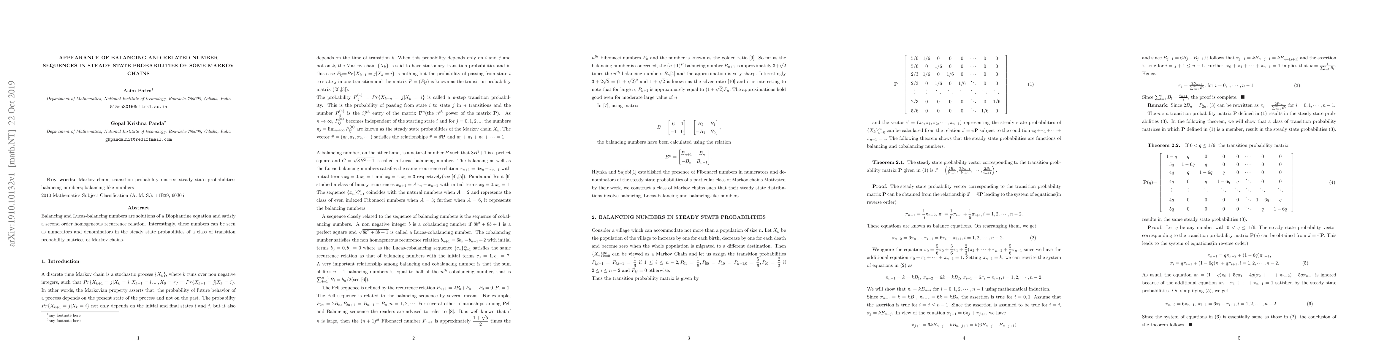 Summary: This paper explores the appearance of balancing and Lucas-balancing numbers in the steady state probabilities of certain Markov chains, revealing their connection to a Diophantine equation and a second-order recurrence relation, and deriving an identity linking them to the silver ratio.