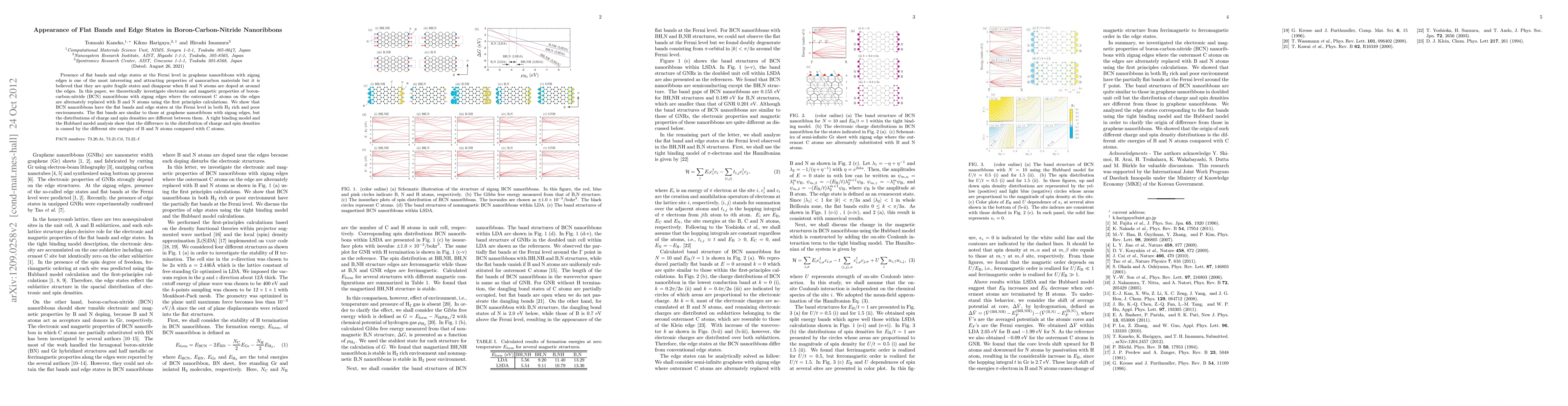 This paper theoretically investigates the electronic properties of boron-carbon-nitride nanoribbons with zigzag edges, revealing the presence of flat bands and edge states at the Fermi level, similar to graphene nanoribbons but with distinct charge and spin density distributions due to different site energies of B and N atoms.