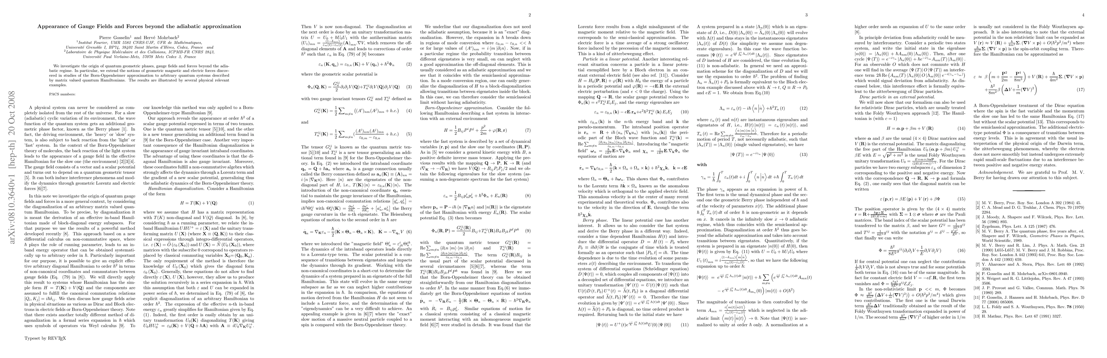 We investigate the origin of quantum geometric phases, gauge fields and forces beyond the adiabatic regime. In particular, we extend the notions of geometric magnetic and electric forces discovered in studies of the Born-Oppenheimer approximation to arbitrary quantum systems described by matrix valued quantum Hamiltonians. The results are illustrated by several physical relevant examples.