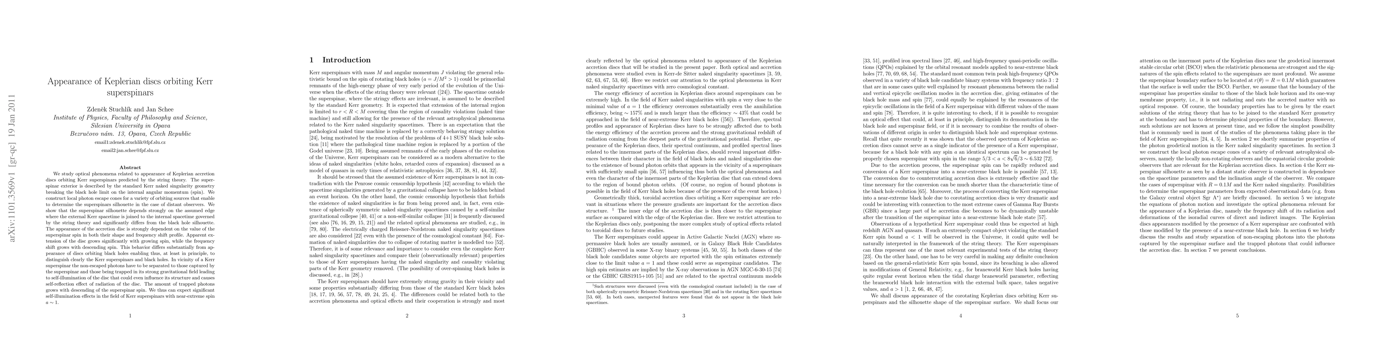 We study optical phenomena related to appearance of Keplerian accretion discs orbiting Kerr superspinars predicted by the string theory. The superspinar exterior is described by the standard Kerr naked singularity geometry breaking the black hole limit on the internal angular momentum (spin). We construct local photon escape cones for a variety of orbiting sources that enable to determine the superspinars silhouette in the case of distant observers. We show that the superspinar silhouette depends strongly on the assumed edge where the external Kerr spacetime is joined to the internal spacetime governed by the string theory and significantly differs from the black hole silhouette. The appearance of the accretion disc is strongly dependent on the value of the superspinar spin in both their shape and frequency shift profile. Apparent extension of the disc grows significantly with growing spin, while the frequency shift grows with descending spin. This behavior differs substantially from appearance of discs orbiting black holes enabling thus, at least in principle, to distinguish clearly the Kerr superspinars and black holes. In vicinity of a Kerr superspinar the non-escaped photons have to be separated to those captured by the superspinar and those being trapped in its strong gravitational field leading to self-illumination of the disc that could even influence its structure and causes self-reflection effect of radiation of the disc. The amount of trapped photons grows with descending of the superspinar spin. We thus can expect significant self-illumination effects in the field of Kerr superspinars with near-extreme spin $a \sim 1$.