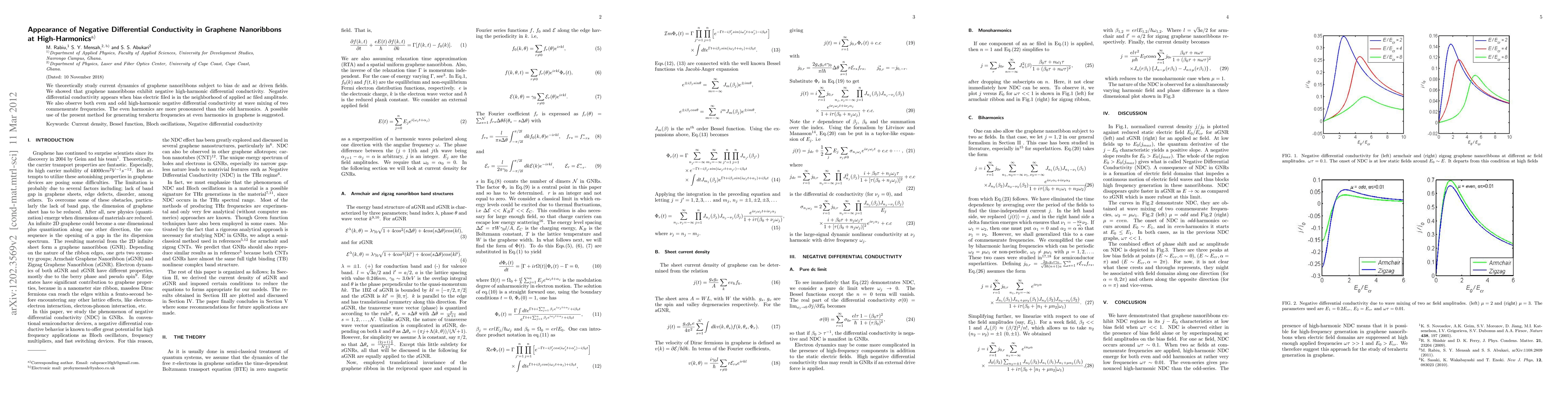 This study theoretically investigates the current dynamics in graphene nanoribbons under combined bias and ac fields, revealing the occurrence of negative differential high-harmonic conductivity, especially when the bias field nears the ac field amplitude. The research also highlights the stronger presence of even harmonics compared to odd ones, suggesting a potential for terahertz frequency generation in graphene.