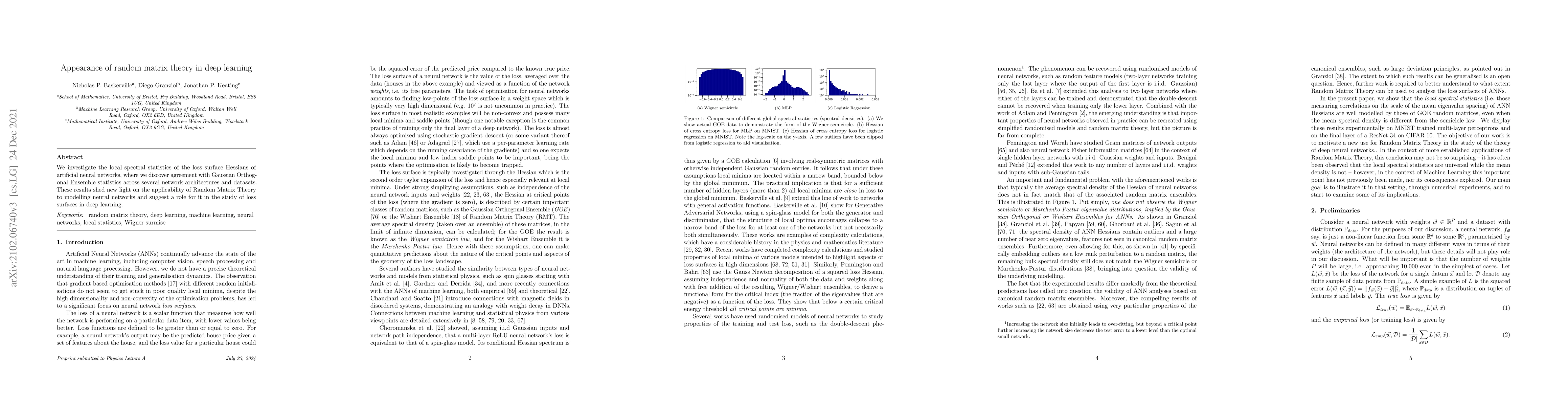 This paper finds that the local spectral statistics of neural network loss surface Hessians align with Gaussian Orthogonal Ensemble statistics, indicating Random Matrix Theory's applicability to deep learning. It proposes a novel model for neural network loss surfaces that accounts for observed spectral densities and highlights the practical implications of the loss surface's complexity in achieving optimal performance.
