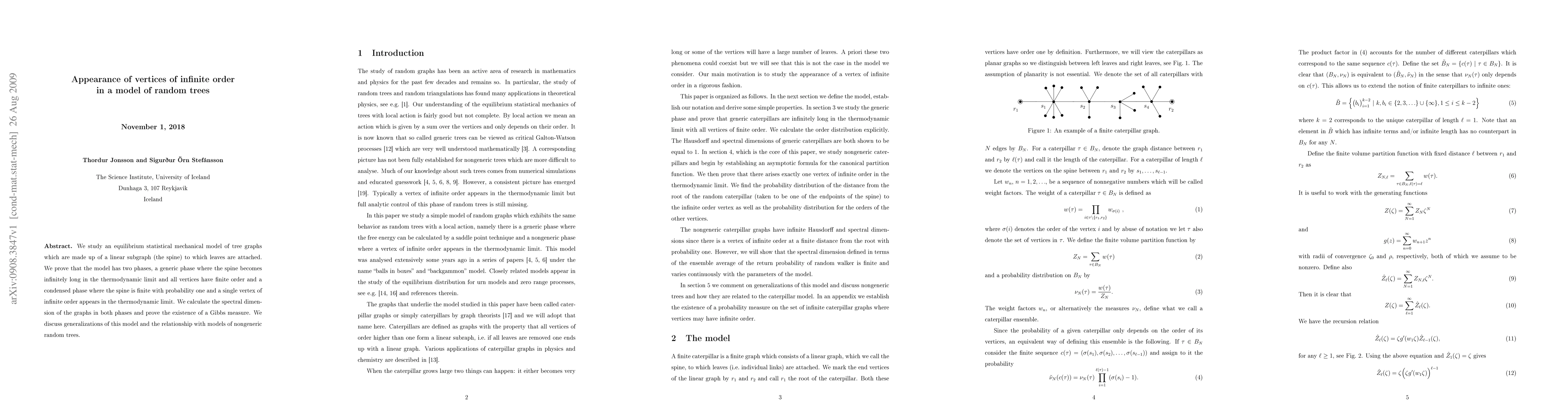 Researchers discovered two phases in a statistical mechanical model of tree graphs: one with an infinitely long spine and finite vertex order, and another with a finite spine and a single infinite-order vertex.