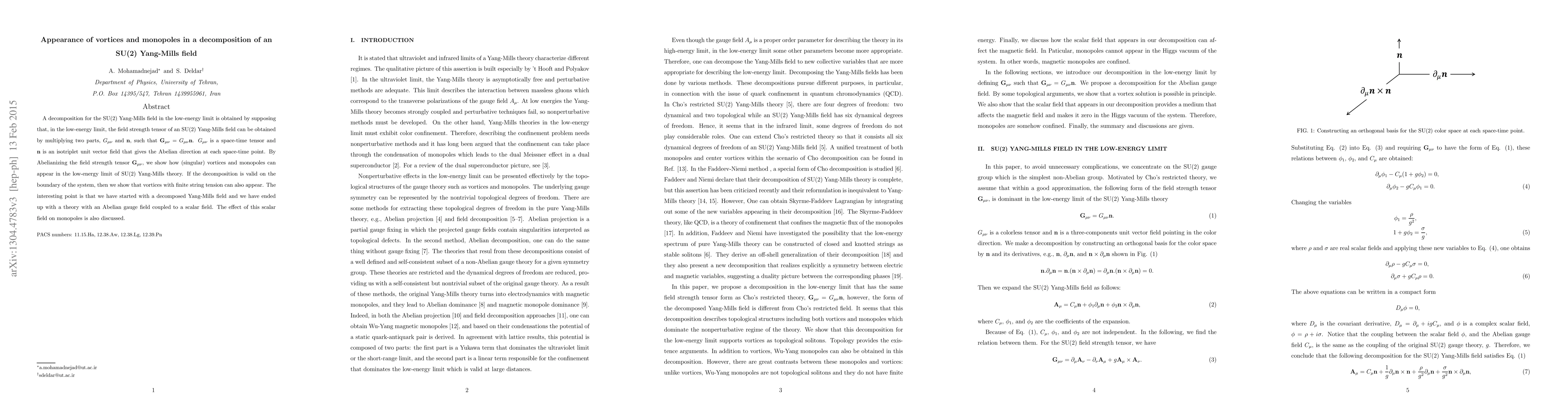 This paper demonstrates the emergence of vortices and monopoles in the low energy limit of SU(2) Yang-Mills theory via a topological soliton approach. It introduces a decomposition of the field strength tensor using an Abelian gauge field and a scalar field, leading to the appearance of vortices and monopoles in the infrared regime.