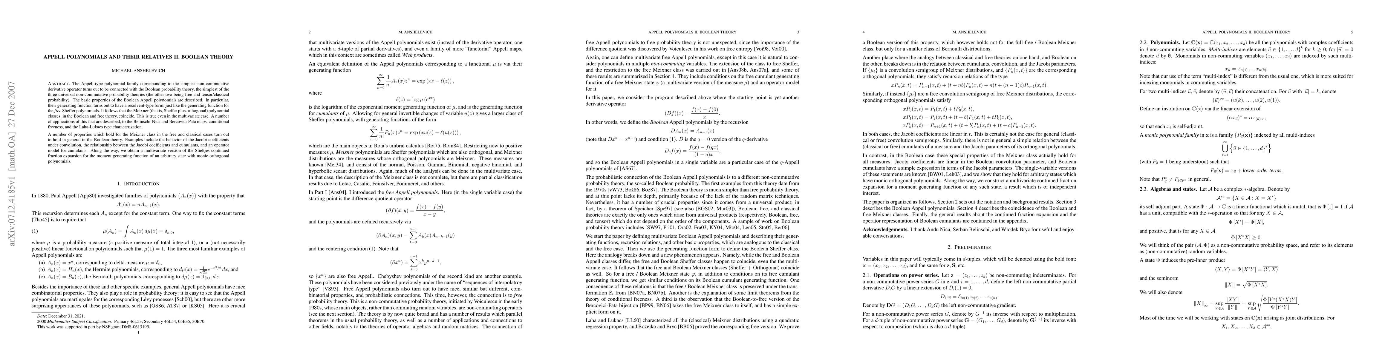 The Appell-type polynomial family corresponding to the simplest non-commutative derivative operator turns out to be connected with the Boolean probability theory, the simplest of the three universal non-commutative probability theories (the other two being free and tensor/classical probability). The basic properties of the Boolean Appell polynomials are described. In particular, their generating function turns out to have a resolvent-type form, just like the generating function for the free Sheffer polynomials. It follows that the Meixner (that is, Sheffer plus orthogonal) polynomial classes, in the Boolean and free theory, coincide. This is true even in the multivariate case. A number of applications of this fact are described, to the Belinschi-Nica and Bercovici-Pata maps, conditional freeness, and the Laha-Lukacs type characterization. A number of properties which hold for the Meixner class in the free and classical cases turn out to hold in general in the Boolean theory. Examples include the behavior of the Jacobi coefficients under convolution, the relationship between the Jacobi coefficients and cumulants, and an operator model for cumulants. Along the way, we obtain a multivariate version of the Stieltjes continued fraction expansion for the moment generating function of an arbitrary state with monic orthogonal polynomials.