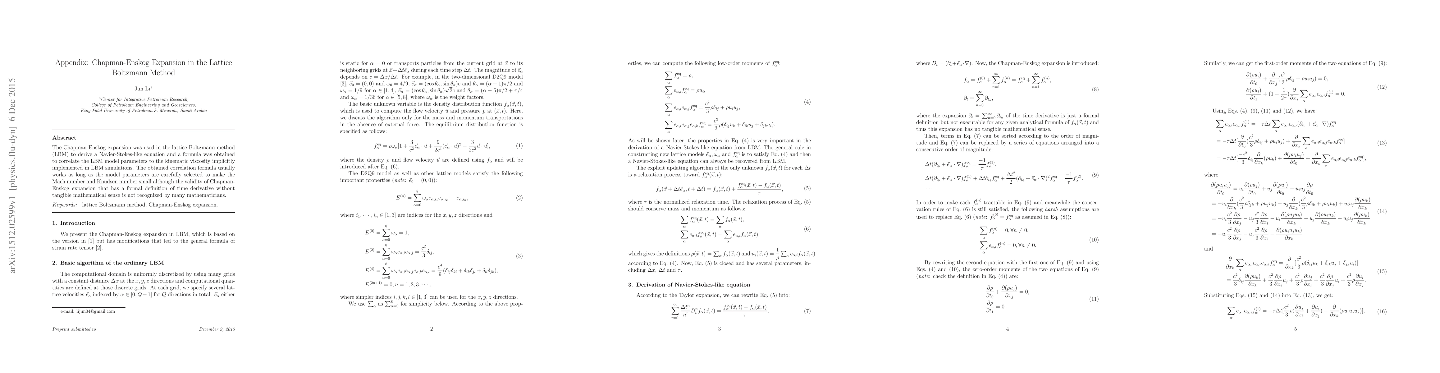 The paper applies the Chapman-Enskog expansion to the lattice Boltzmann method to derive a Navier-Stokes-like equation and correlate LBM parameters to kinematic viscosity, emphasizing the importance of small Mach and Knudsen numbers for validity despite mathematical concerns.