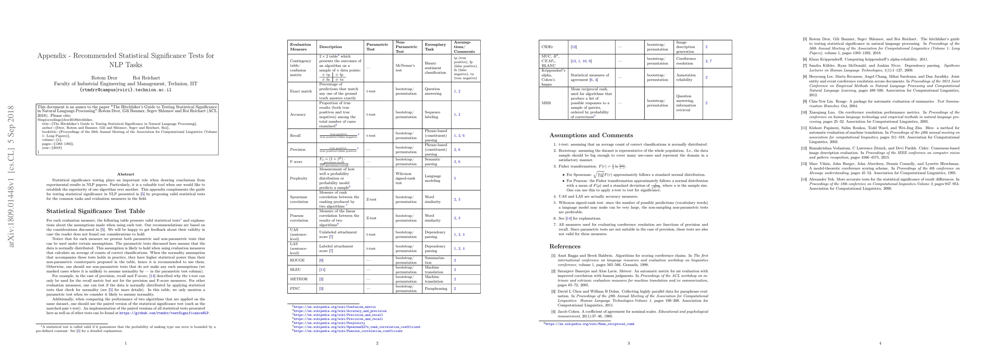 Statistical significance testing plays an important role when drawing conclusions from experimental results in NLP papers. Particularly, it is a valuable tool when one would like to establish the superiority of one algorithm over another. This appendix complements the guide for testing statistical significance in NLP presented in \cite{dror2018hitchhiker} by proposing valid statistical tests for the common tasks and evaluation measures in the field.