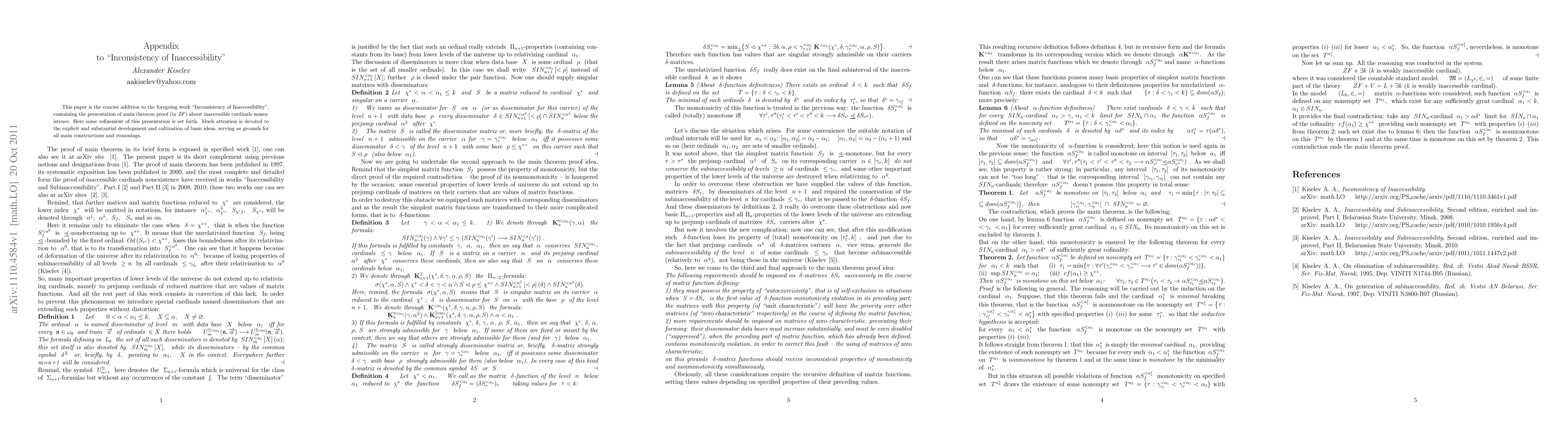 This paper is the concise addition to the foregoing work "Inconsistency of Inaccessibility", containing the presentation of main theorem proof (in ZF) about inaccessible cardinals nonexistence. Here some refinement of this presentation is set forth. Much attention is devoted to the explicit and substantial development and cultivation of basic ideas, serving as grounds for all main constructions and reasonings.
