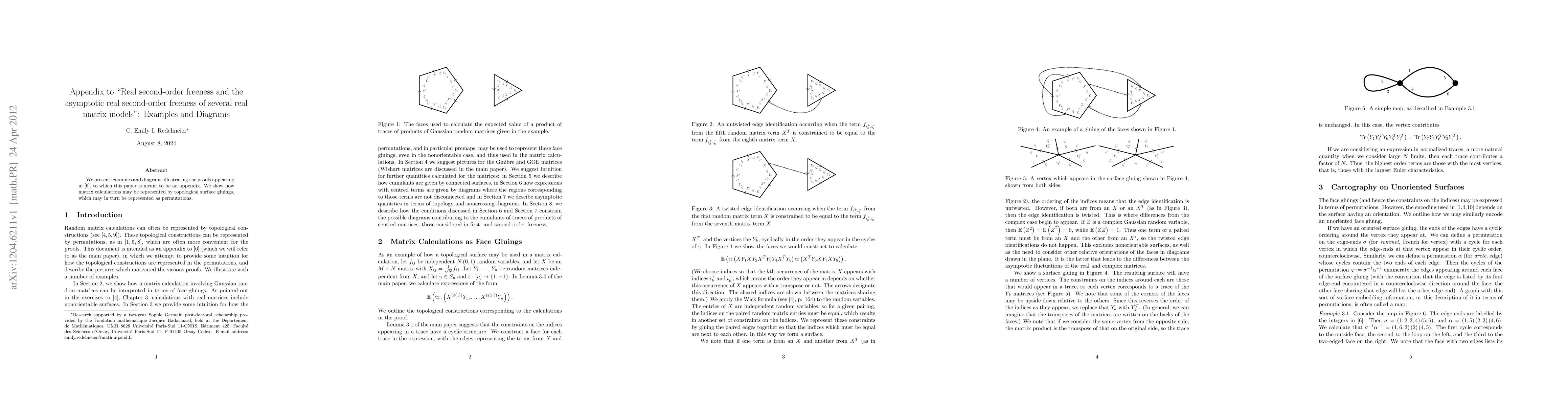We present examples and diagrams illustrating the proofs appearing in "Real second-order freeness and the asymptotic real second-order freeness of several real matrix models", to which this paper is meant to be an appendix. We show how matrix calculations may be represented by topological surface gluings, which may in turn be represented as permutations.