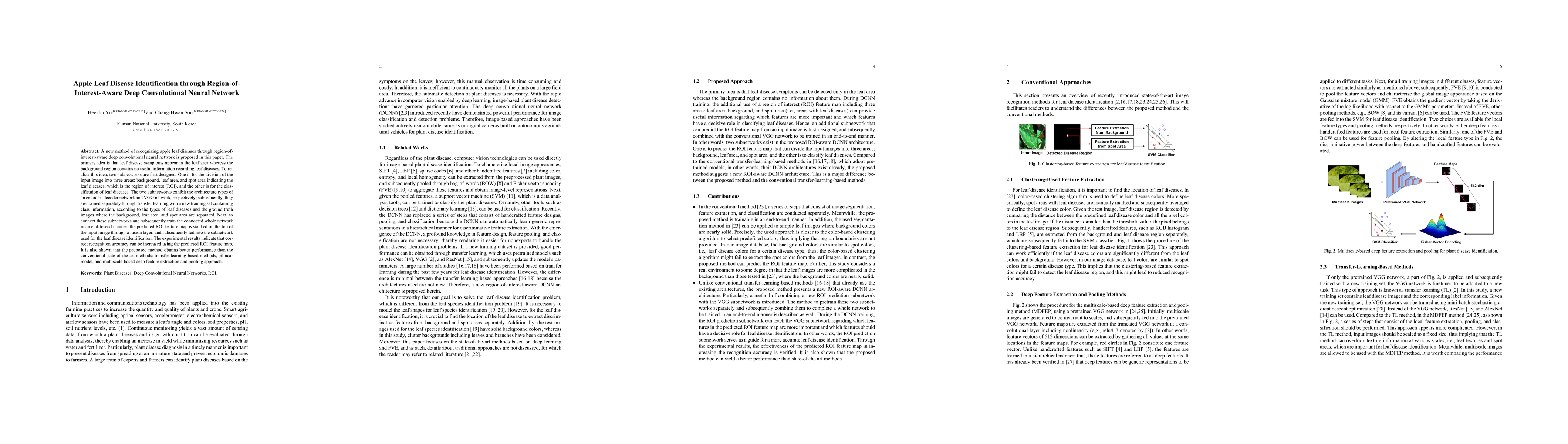 This paper proposes a novel method for identifying apple leaf diseases using a region-of-interest-aware deep convolutional neural network. The method employs two subnetworks to segment the leaf image into relevant areas and classify diseases, achieving higher accuracy compared to existing state-of-the-art techniques.