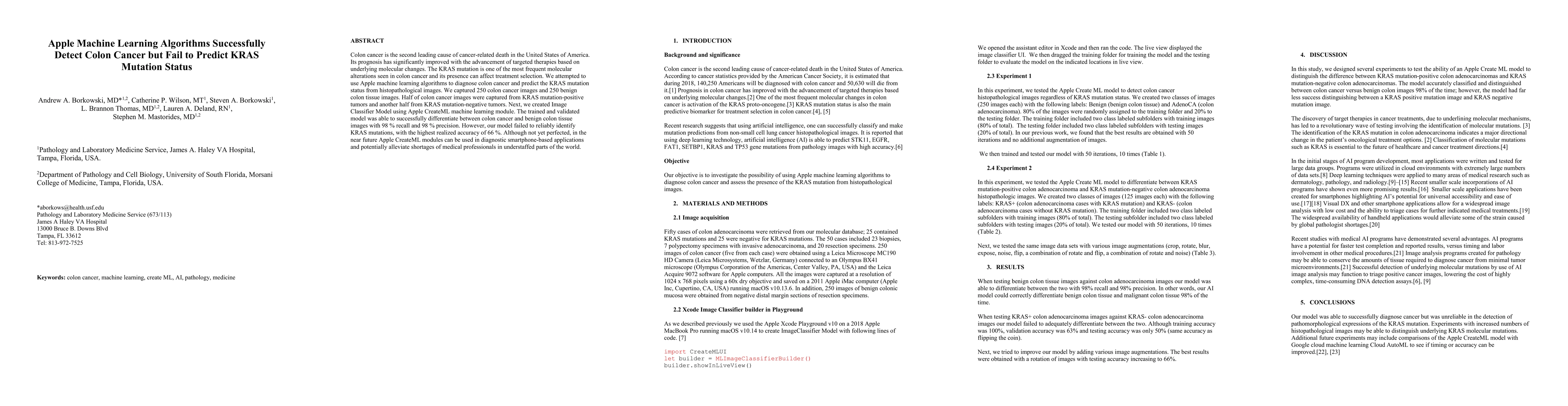 This study successfully employed Apple machine learning algorithms to diagnose colon cancer from histopathological images with high accuracy but failed to predict KRAS mutation status, achieving only 66% accuracy. Despite the limitation in mutation prediction, the potential for smartphone-based diagnostic tools is promising.