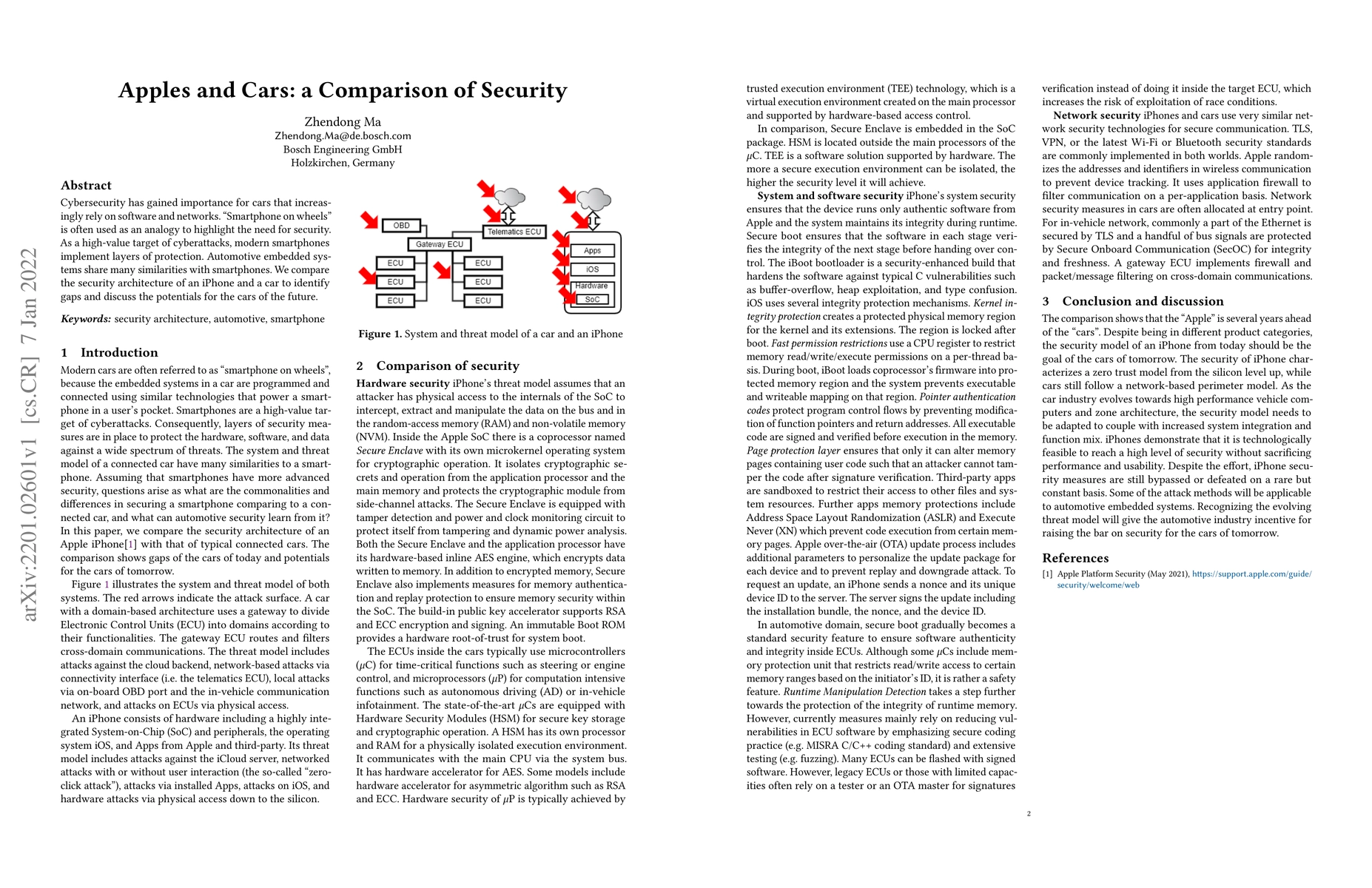 Cybersecurity has gained importance for cars that increasingly rely on software and networks. "Smartphone on wheels" is often used as an analogy to highlight the need for security. As a high-value target of cyberattacks, modern smartphones implement layers of protection. Automotive embedded systems share many similarities with smartphones. We compare the security architecture of an iPhone and a car to identify gaps and discuss the potentials for the cars of the future.