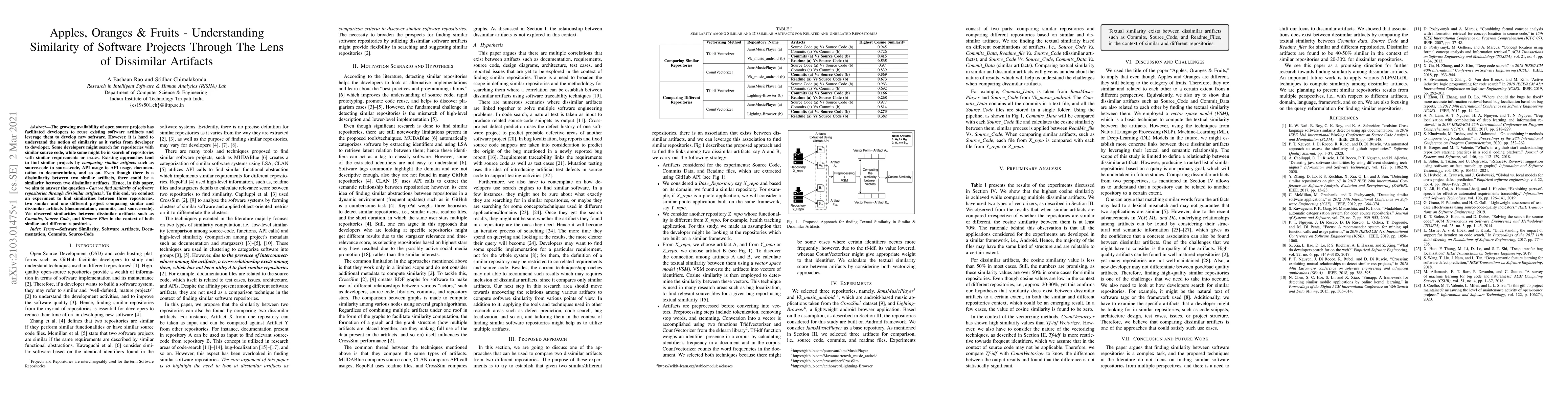 The growing availability of open source projects has facilitated developers to reuse existing software artifacts and leverage them to develop new software. However, it is hard to understand the notion of similarity as it varies from developer to developer. Some developers might search for repositories with similar source code, while some might be in search of repositories with similar requirements or issues. Existing approaches tend to find similar projects by comparing similar artifacts such as source-code to source-code, API usage to API usage, documentation to documentation, and so on. Even though there is a dissimilarity between two similar artifacts, there could be a similarity between two dissimilar artifacts. Hence, in this paper, we aim to answer the question - Can we find similarity of software repositories through dissimilar artifacts?. To this end, we conduct an experiment to find similarities between three repositories, two similar and one different project comparing similar and dissimilar artifacts (documentation, commits, and source-code). We observed similarities between dissimilar artifacts such as Commits, Source Code, and Readme Files in the context of both similar and different repositories.