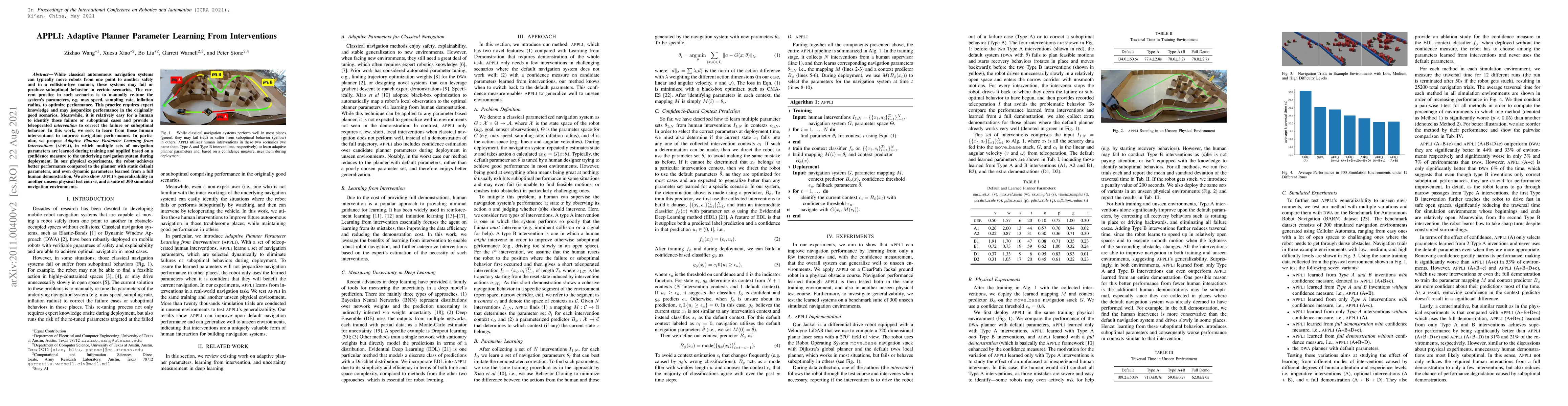 The paper introduces APPLI, a method for adaptively learning navigation parameters from human interventions to improve robot performance in challenging scenarios. APPLI outperforms both static and dynamically tuned parameters in both physical and simulated environments.