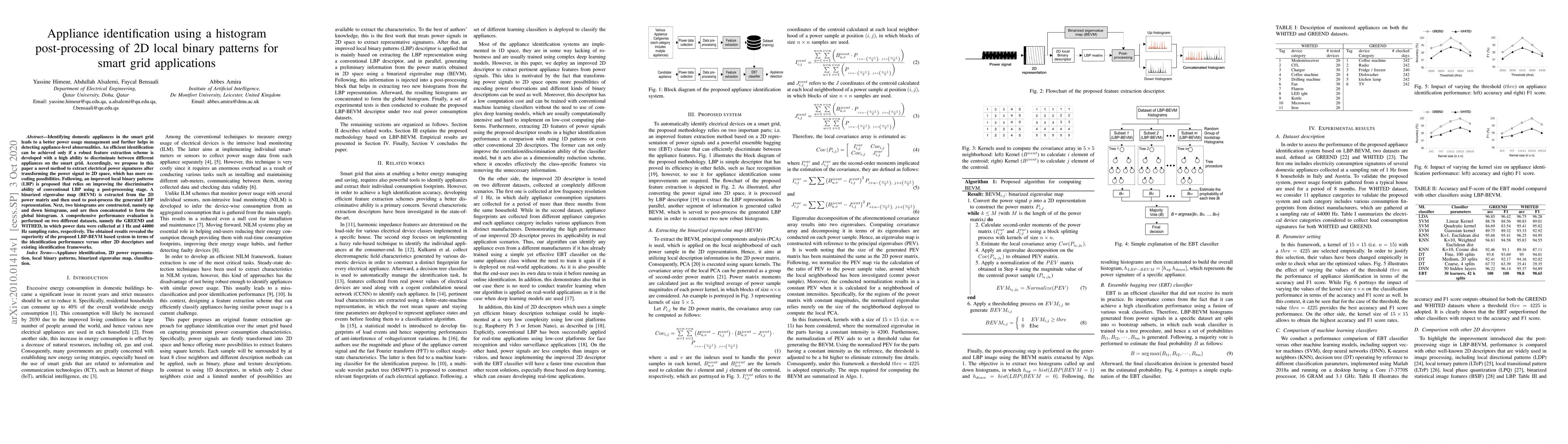 A novel method is proposed for identifying domestic appliances in smart grids using 2D local binary patterns post-processed with a binarized eigenvalue map, achieving superior performance over existing systems.