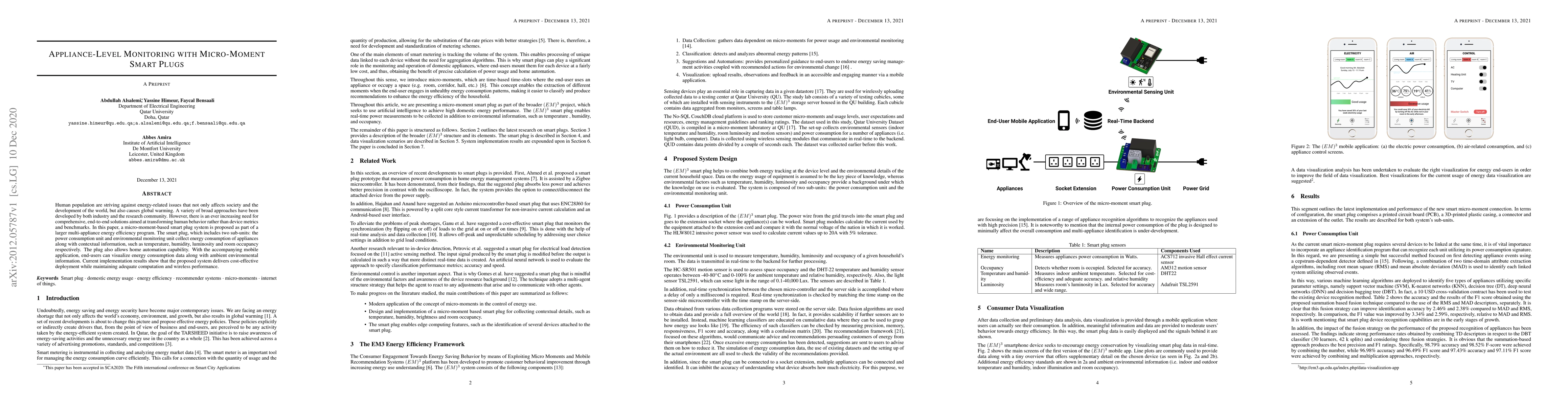 A micro-moment smart plug system is proposed to monitor energy consumption of appliances, providing real-time data and home automation capabilities. The system delivers cost-effective deployment while maintaining adequate performance and wireless connectivity.