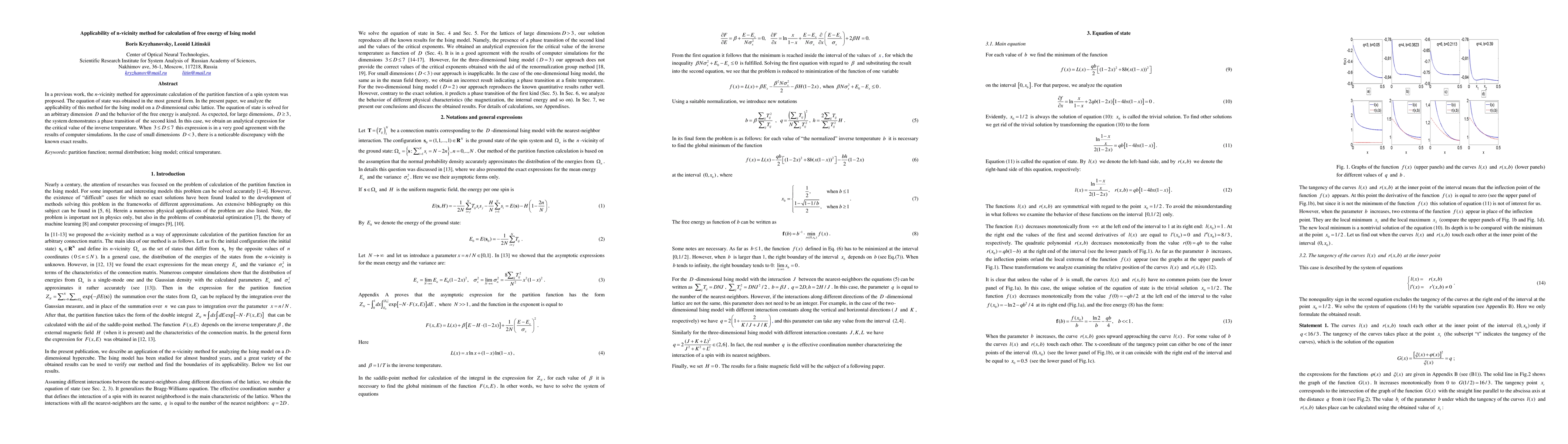 In a previous work, the n-vicinity method for approximate calculation of the partition function of a spin system was proposed. The equation of state was obtained in the most general form. In the present paper, we analyze the applicability of this method for the Ising model on a D-dimensional cubic lattice. The equation of state is solved for an arbitrary dimension D and the behavior of the free energy is analyzed. As expected, for large dimensions (D > 2) the system demonstrates a phase transition of the second kind. In this case, we obtain an analytical expression for the critical value of the inverse temperature. When 2 < D < 8 this expression is in a very good agreement with the results of computer simulations. In the case of small dimensions (D < 3), there is a noticeable discrepancy with the known exact results.