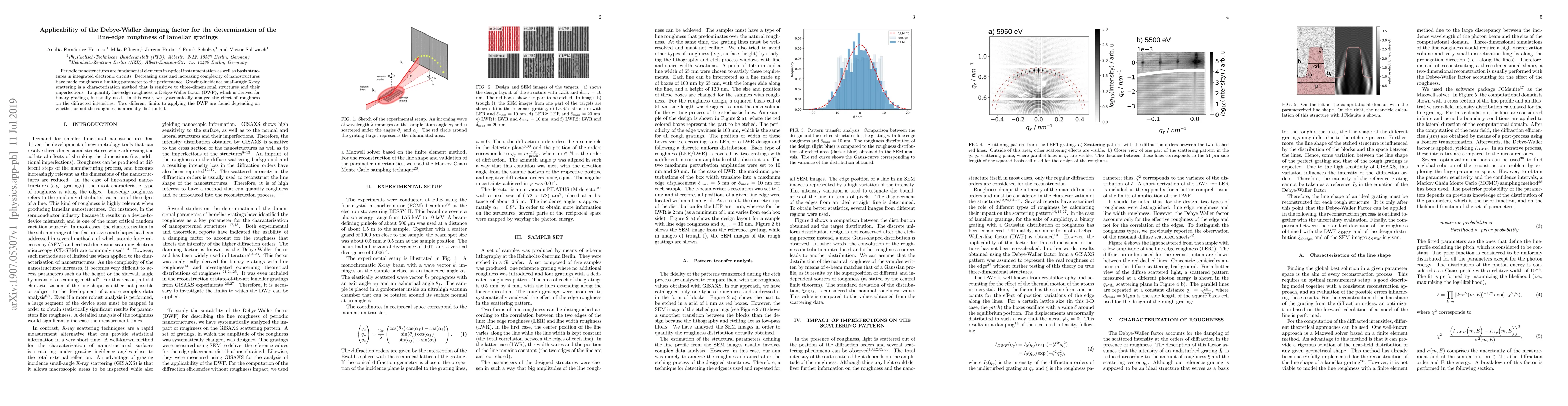 This paper investigates the use of the Debye-Waller damping factor for determining line-edge roughness in lamellar gratings, finding that its applicability depends on the distribution of roughness, with distinct limits for normally distributed and non-normally distributed roughness. Grazing-incidence small-angle X-ray scattering is employed to characterize the three-dimensional structures and their imperfections.