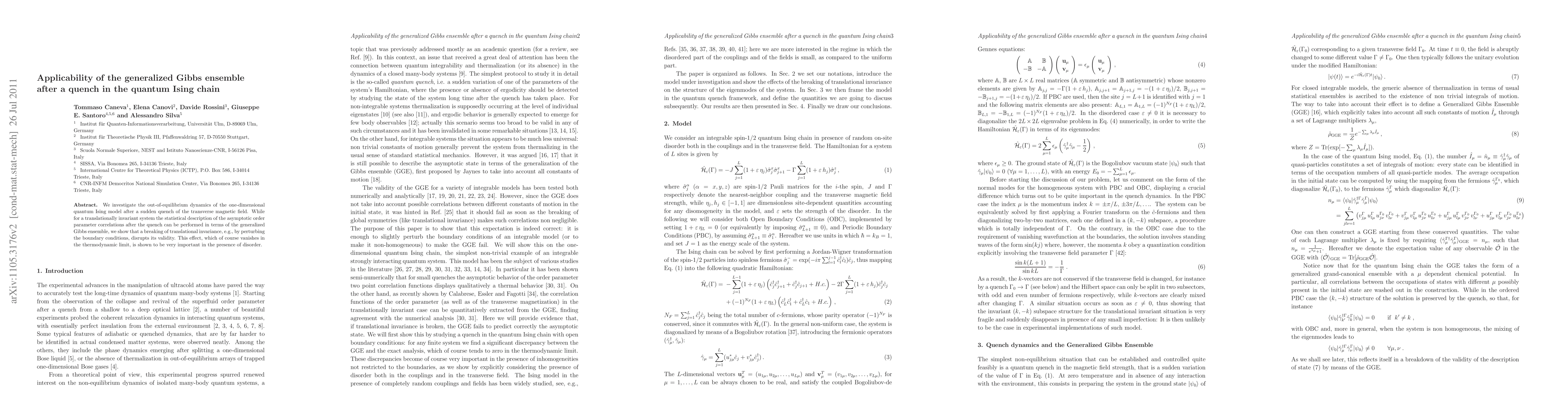 This study examines the dynamics of the one-dimensional quantum Ising model post-quench, revealing that the generalized Gibbs ensemble accurately describes the asymptotic order parameter correlations for translationally invariant systems. However, changes in boundary conditions, introducing disorder, disrupt this ensemble's applicability, highlighting its sensitivity to translational invariance.