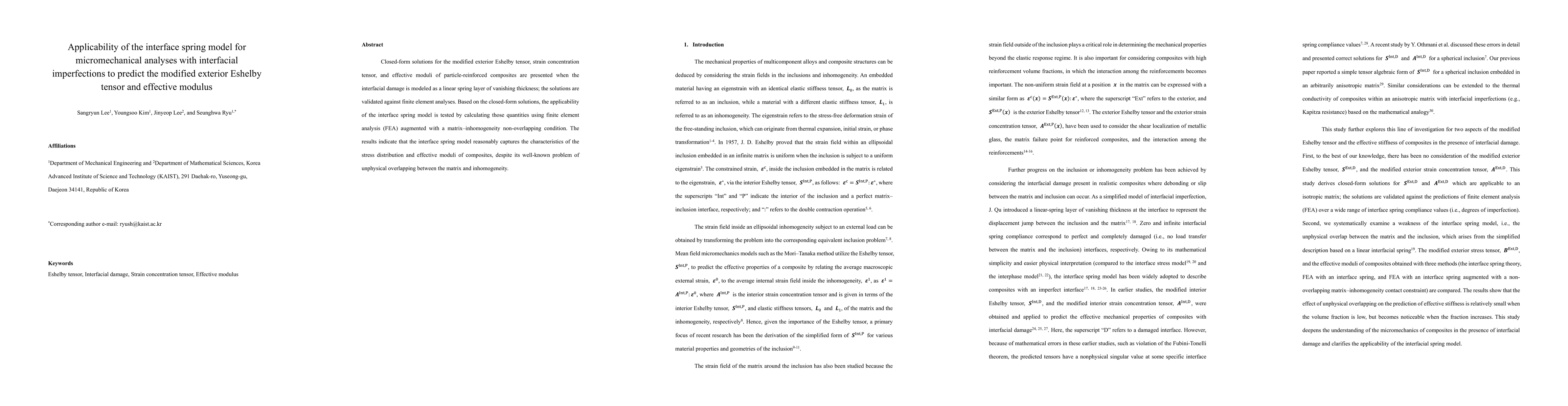 Closed-form solutions for the modified exterior Eshelby tensor, strain concentration tensor, and effective moduli of particle-reinforced composites are presented when the interfacial damage is modeled as a linear spring layer of vanishing thickness; the solutions are validated against finite element analyses. Based on the closed-form solutions, the applicability of the interface spring model is tested by calculating those quantities using finite element analysis (FEA) augmented with a matrix-inhomogeneity non-overlapping condition. The results indicate that the interface spring model reasonably captures the characteristics of the stress distribution and effective moduli of composites, despite its well-known problem of unphysical overlapping between the matrix and inhomogeneity.