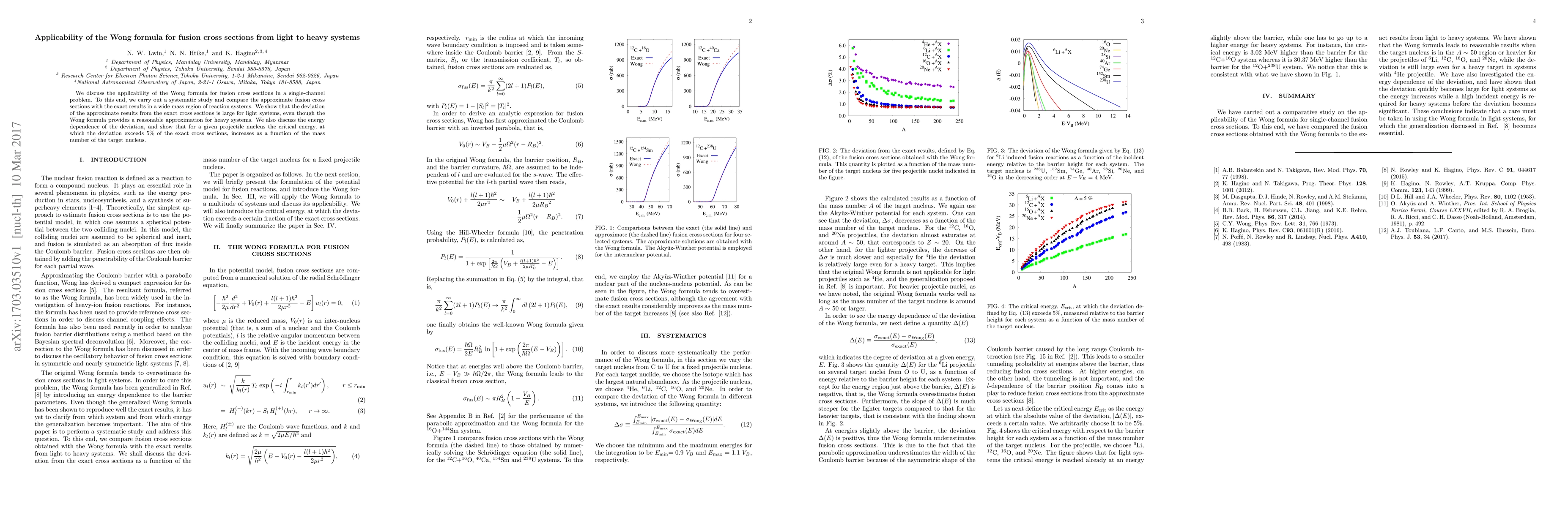 The Wong formula provides a reasonable approximation for fusion cross sections in heavy systems but shows significant deviations in light systems. The critical energy for a 5% deviation increases with the mass number of the target nucleus.