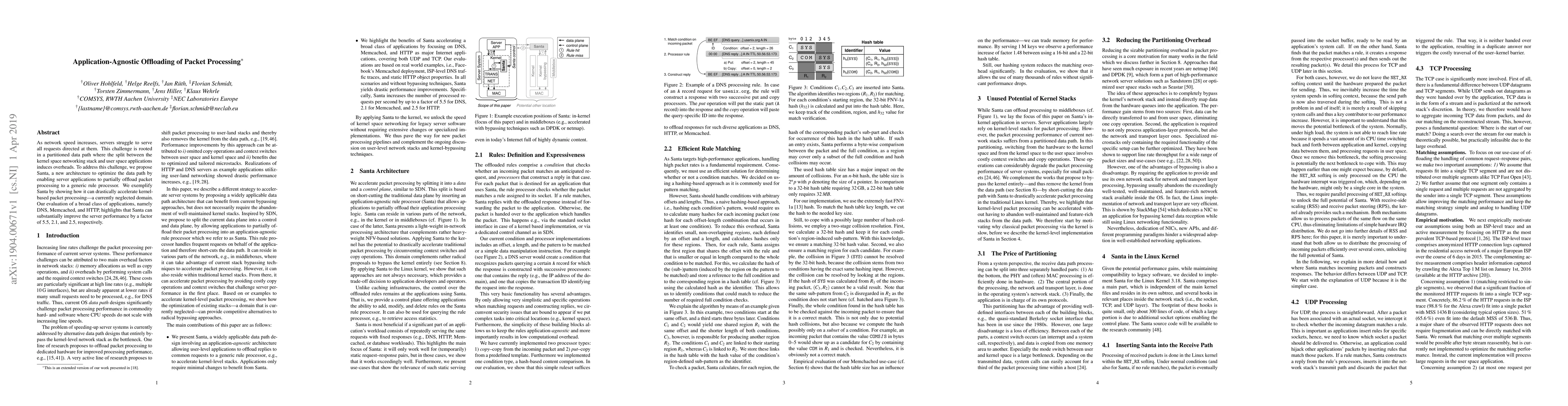 The paper proposes Santa, a new architecture to optimize packet processing by enabling server applications to offload tasks to a generic rule processor, thereby reducing overhead from the partitioned data path. Evaluations show Santa can significantly improve performance for DNS, Memcached, and HTTP applications by factors of 5.5, 2.1, and 2.5, respectively.