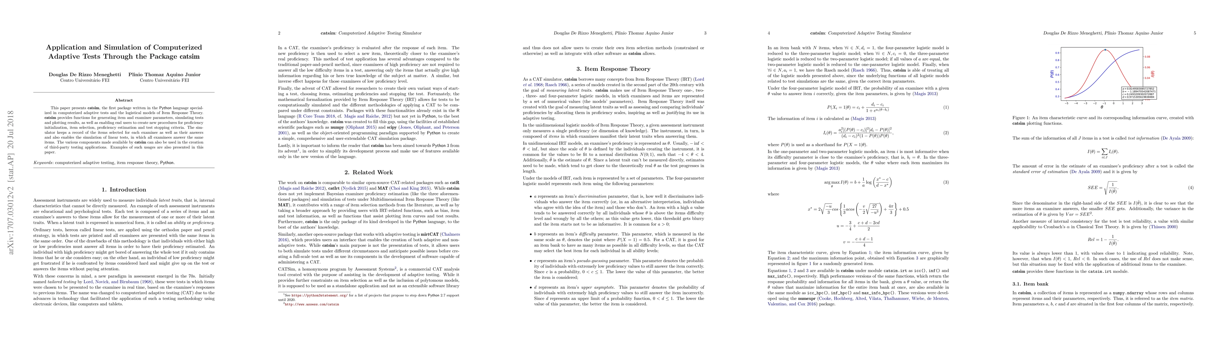 This paper introduces catsim, a Python package for computerized adaptive tests based on Item Response Theory, offering functions for test simulation, parameter generation, and result visualization. It also allows for custom procedures in test administration and stopping criteria.