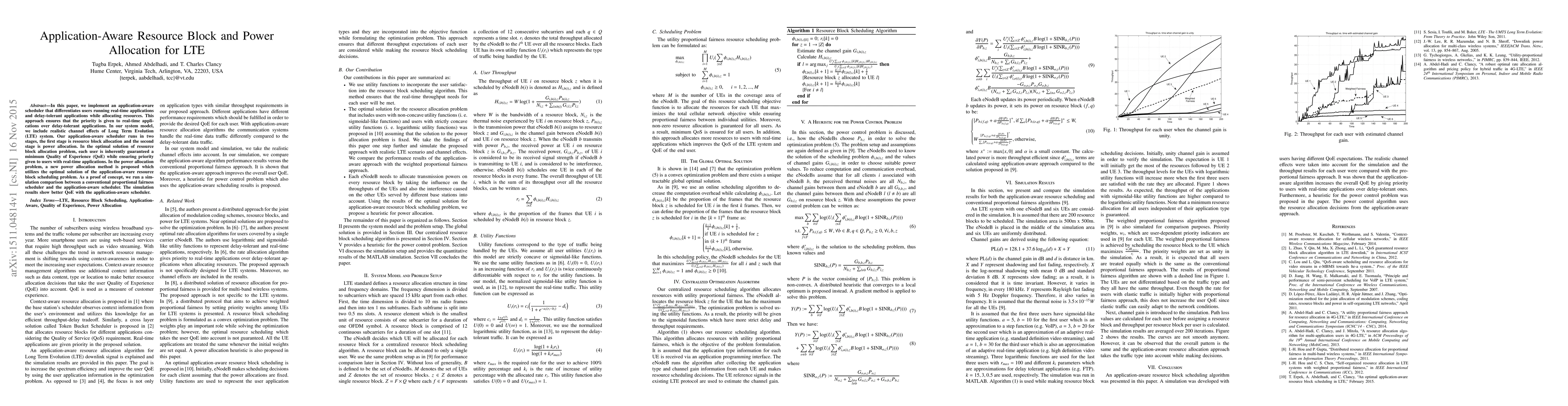 The paper presents an application-aware resource block and power allocation algorithm for LTE, incorporating utility functions to represent user satisfaction and ensuring priority for real-time applications.