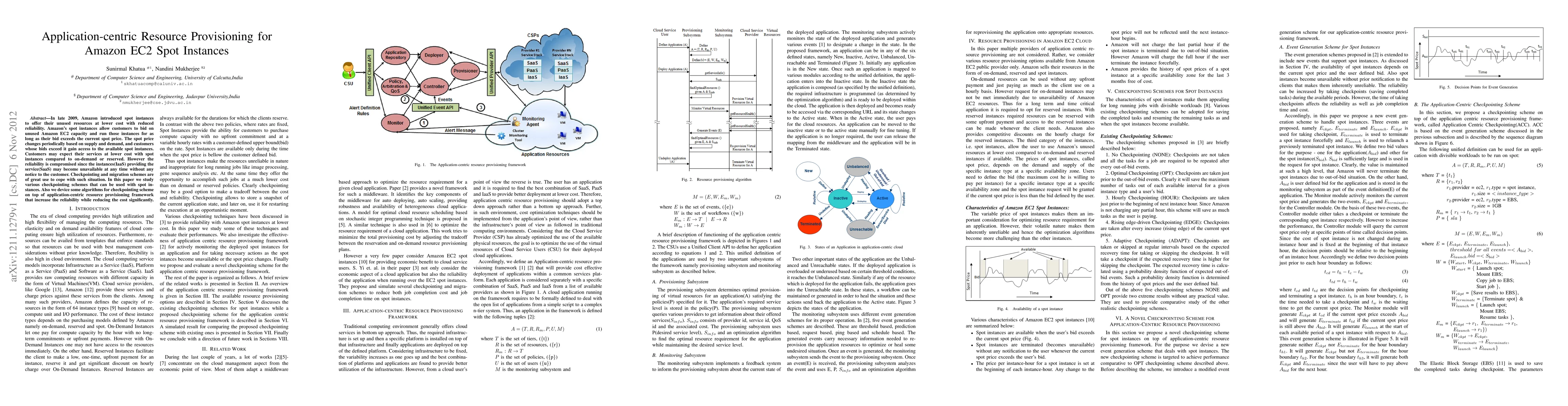 This paper explores application-centric resource provisioning strategies for Amazon EC2 Spot Instances, focusing on enhancing reliability through checkpointing schemes while significantly reducing costs compared to on-demand or reserved instances. The proposed algorithms aim to improve the resilience of applications running on spot instances by effectively managing interruptions.