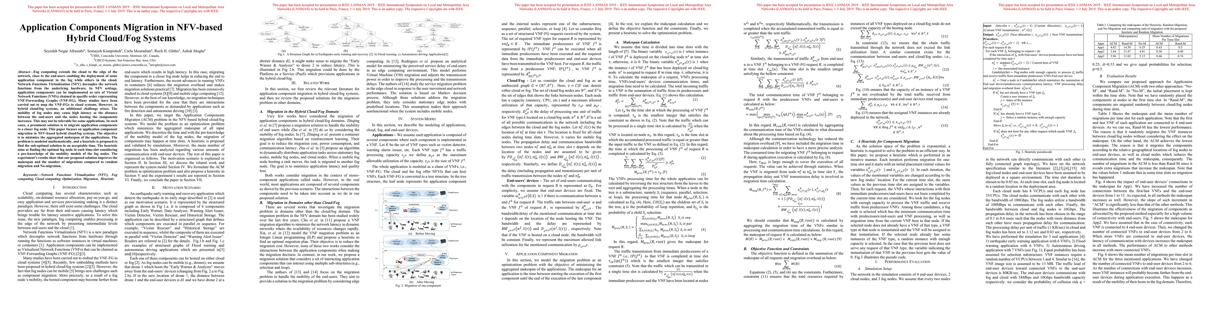 This paper explores application component migration strategies in NFV-based hybrid cloud/fog systems to minimize aggregated application makespan. A heuristic is proposed to determine optimal fog node placements based on fog node mobility models, demonstrating improved makespan and reduced migrations compared to random and no-migration approaches.