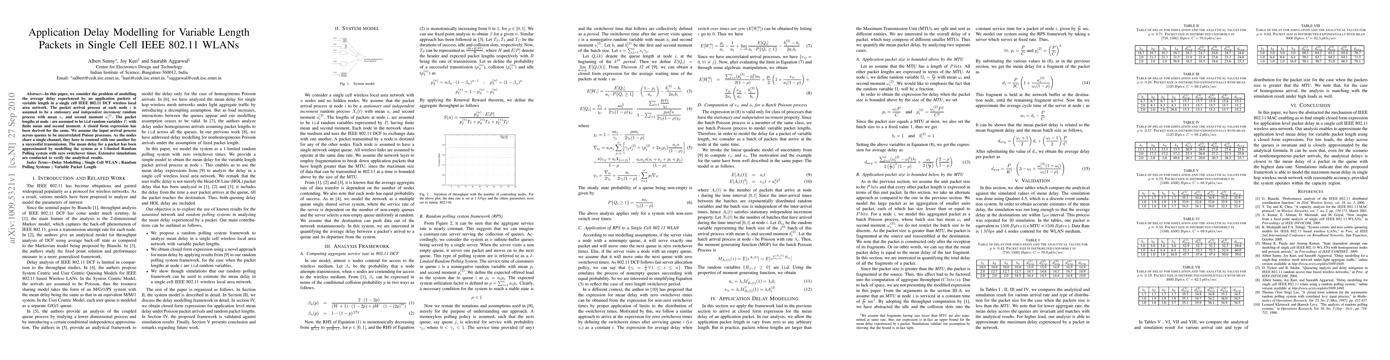In this paper, we consider the problem of modelling the average delay experienced by an application packets of variable length in a single cell IEEE 802.11 DCF wireless local area network. The packet arrival process at each node i is assumed to be a stationary and independent increment random process with mean ai and second moment a(2) i . The packet lengths at node i are assumed to be i.i.d random variables Pi with finite mean and second moment. A closed form expression has been derived for the same. We assume the input arrival process across queues to be uncorrelated Poison processes. As the nodes share a single channel, they have to contend with one another for a successful transmission. The mean delay for a packet has been approximated by modelling the system as a 1-limited Random Polling system with zero switchover times. Extensive simulations are conducted to verify the analytical results.