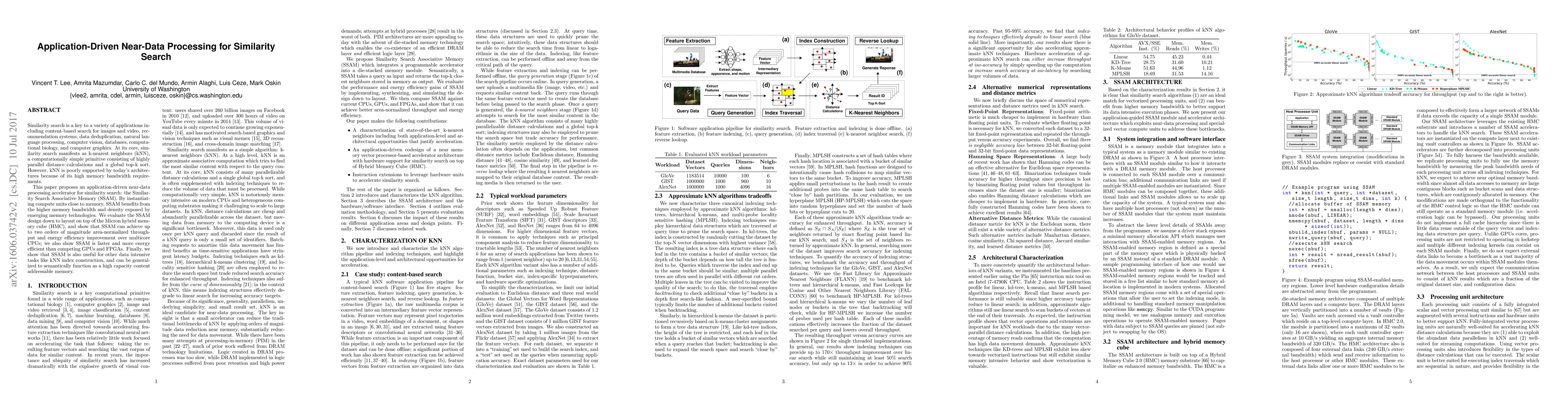 This paper introduces an application-driven near-data processing accelerator called Similarity Search Associative Memory (SSAM) to improve the efficiency of similarity search tasks. SSAM achieves significant improvements in throughput and energy efficiency compared to traditional CPUs, GPUs, and FPGAs by leveraging high memory bandwidth and density of emerging memory technologies.