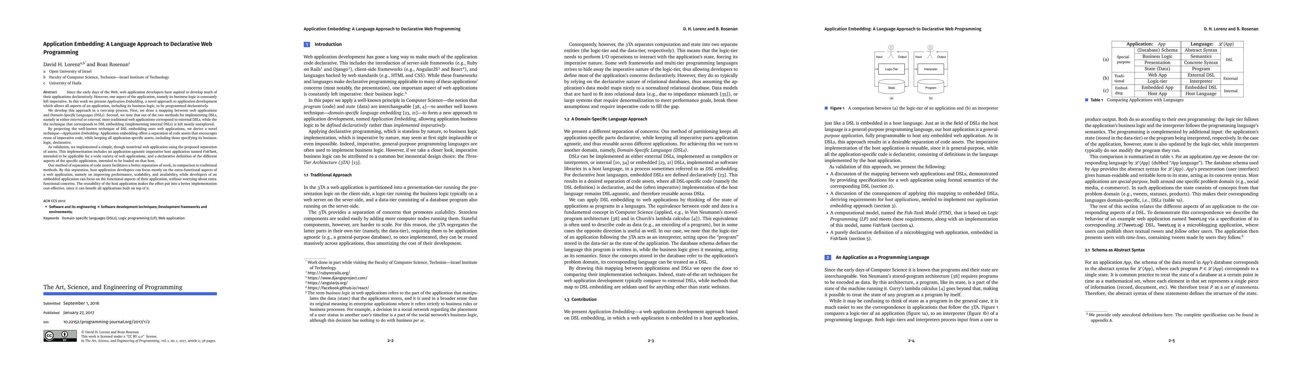 This paper introduces Application Embedding, a novel declarative programming approach for web applications that allows all aspects, including business logic, to be programmed declaratively. The method separates imperative and declarative code assets, enabling host applications to focus on performance and scalability while embedded applications concentrate on functional aspects.