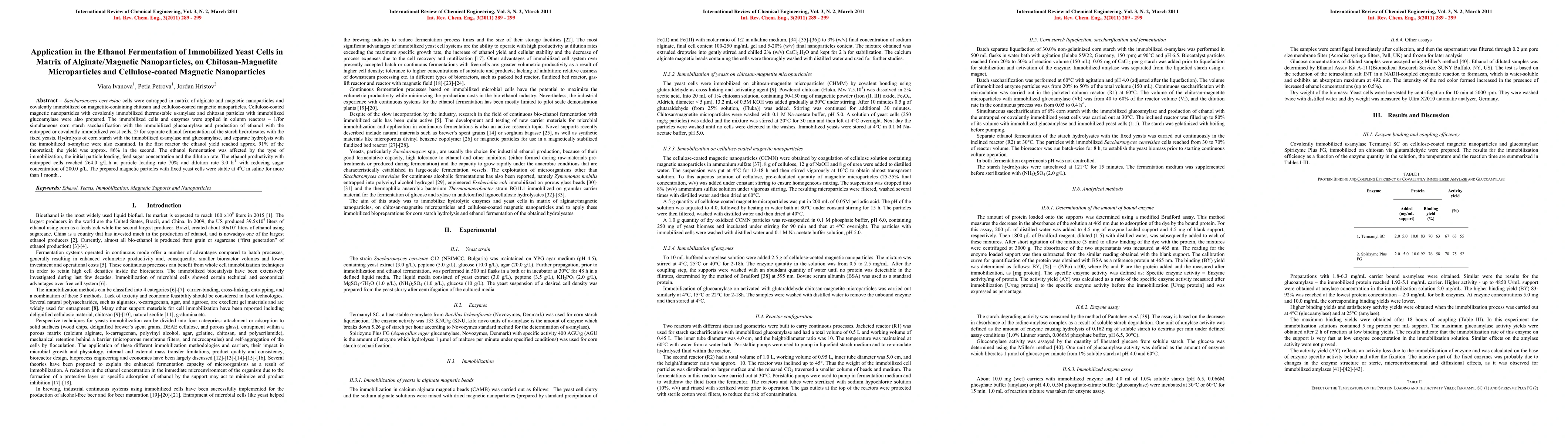 Saccharomyces cerevisiae cells were entrapped in matrix of alginate and magnetic nanoparticles and covalently immobilized on magnetite-containing chitosan and cellulose-coated magnetic nanoparticles. Cellulose-coated magnetic nanoparticles with covalently immobilized thermostable {\alpha}-amylase and chitosan particles with immobilized glucoamylase were also prepared. The immobilized cells and enzymes were applied in column reactors - 1/for simultaneous corn starch saccharification with the immobilized glucoamylase and production of ethanol with the entrapped or covalently immobilized yeast cells, 2/ for separate ethanol fermentation of the starch hydrolysates with the fixed yeasts. Hydrolysis of corn starch with the immobilized {\alpha}-amylase and glucoamylase, and separate hydrolysis with the immobilized {\alpha}-amylase were also examined. In the first reactor the ethanol yield reached approx. 91% of the theoretical; the yield was approx. 86% in the second. The ethanol fermentation was affected by the type of immobilization, the initial particle loading, feed sugar concentration and the dilution rate. The ethanol productivity with entrapped cells reached 264.0 g/L.h at particle loading rate 70% and dilution rate 3.0 h-1 with reducing sugar concentration of 200.0 g/L. The prepared magnetic particles with fixed yeast cells were stable at 4oC in saline for more than 1 month. .