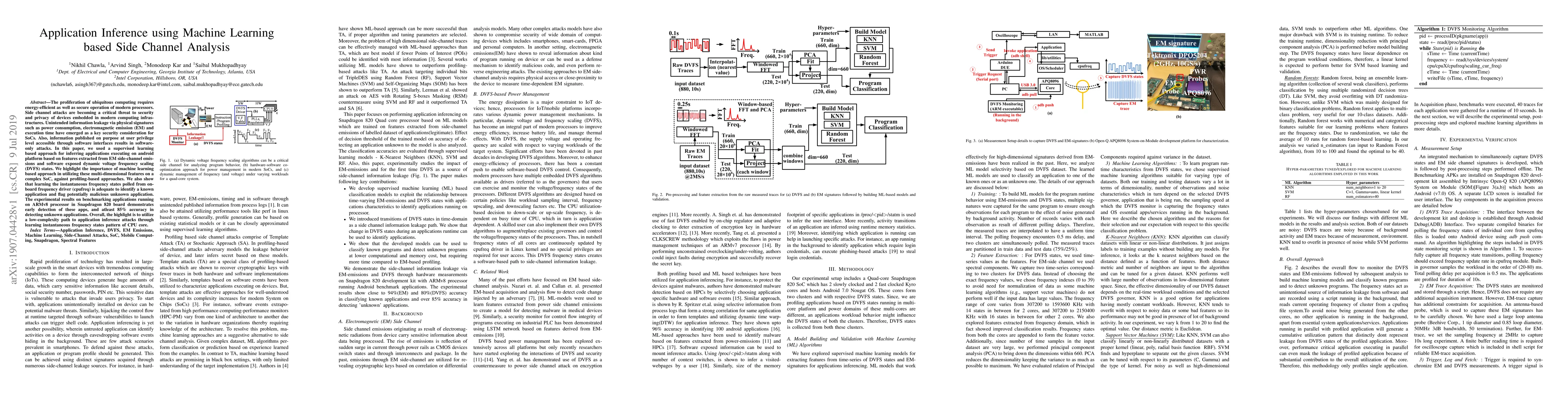 This paper proposes a machine learning-based method for inferring applications on Android using electromagnetic emissions and dynamic voltage frequency scaling states, achieving high accuracy in detecting both known and unknown applications. The study emphasizes the effectiveness of this approach over traditional profiling-based methods, demonstrating early detection capabilities with at least 85% accuracy.
